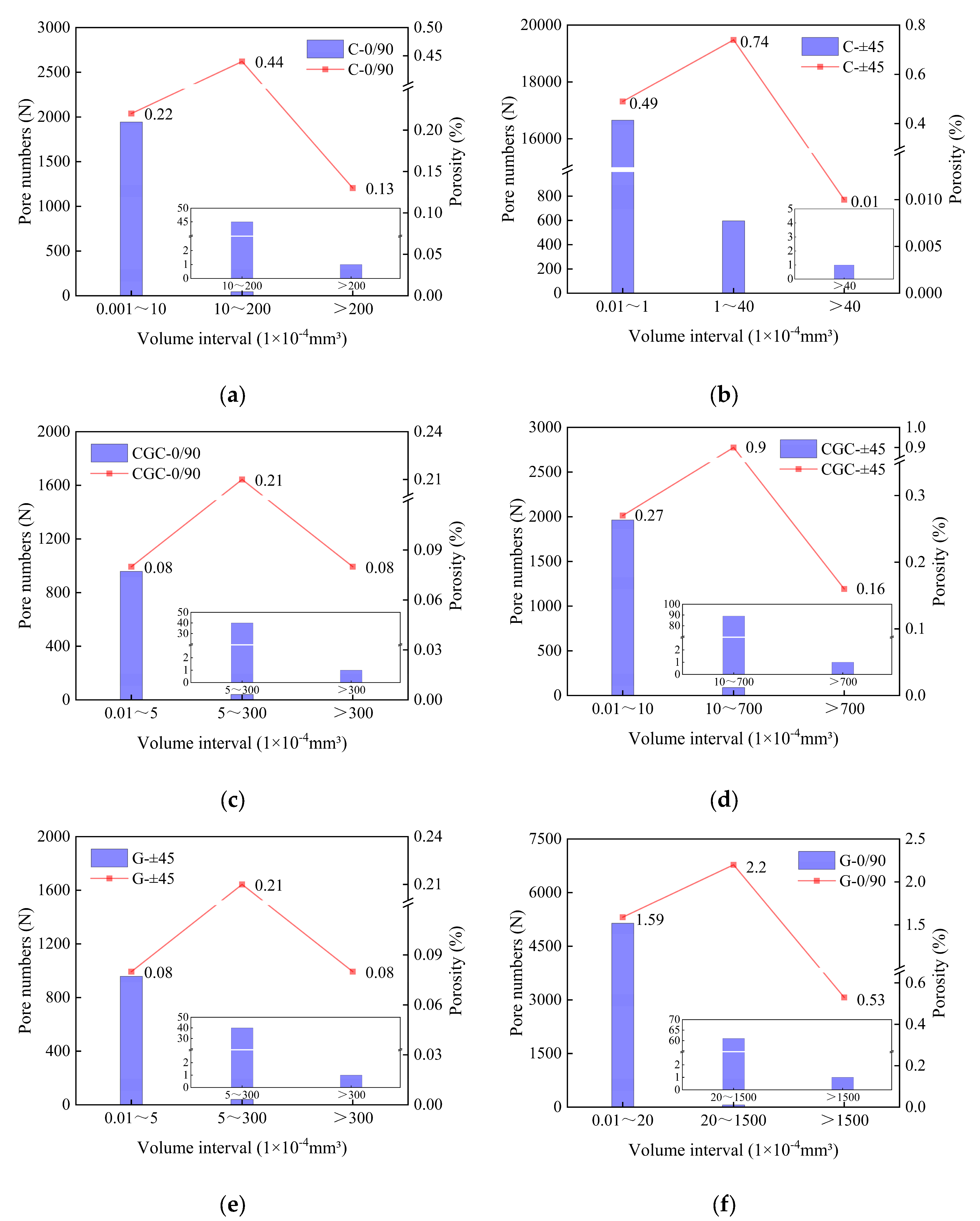 3), the left vertical axis indicates the number of pores and the right vertical axis represents the percentage of the total pore volume within this interval to the total pore volume of the sample (i.e., volume porosity). In pure carbon fiber laminates (C0/90 and C±45), pores are mainly concentrated in the micro-size interval (<10 × 10