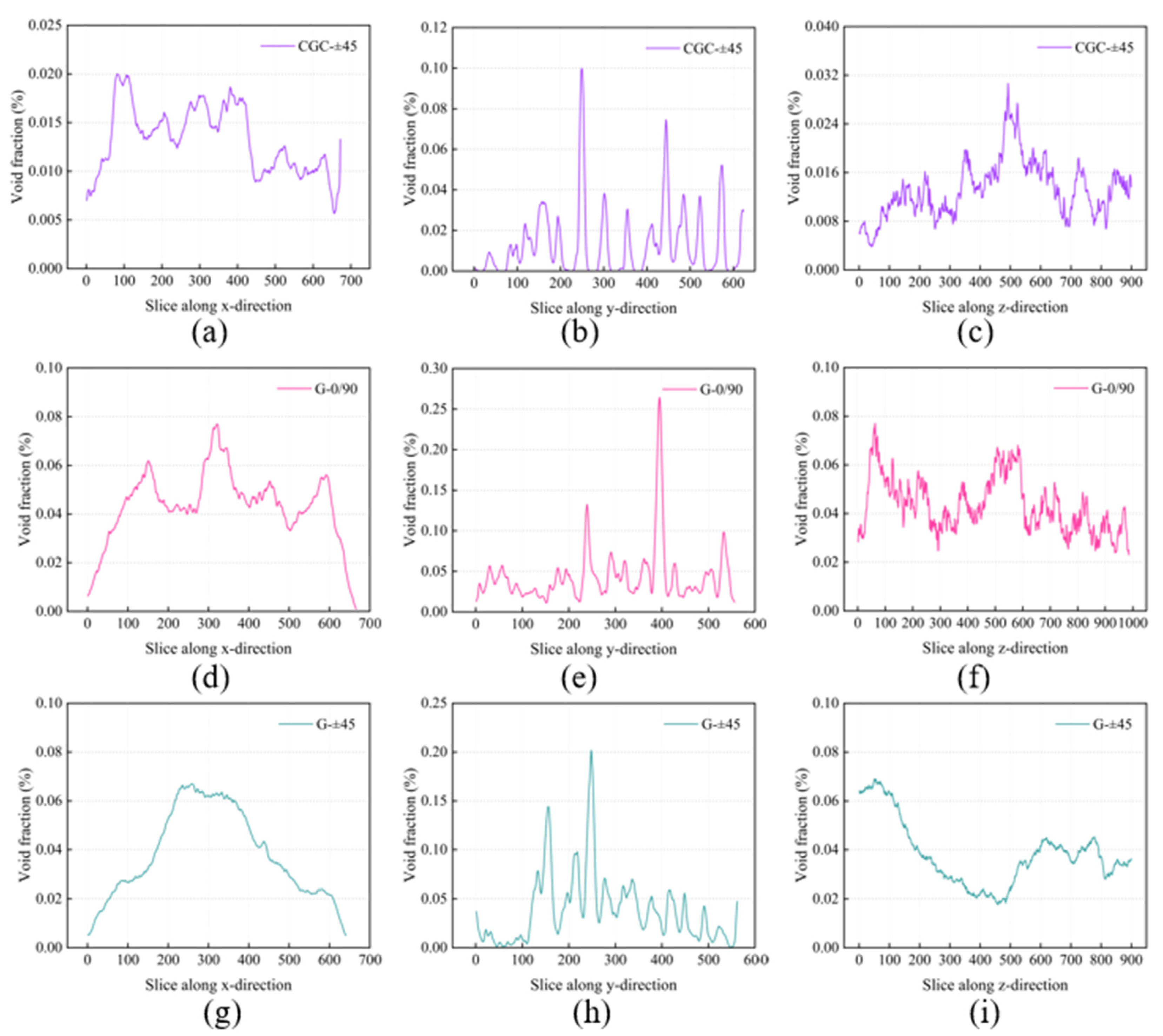 The influence of ply angle on the distribution of porosity should also not be overlooked. For the same material system, the face porosity of ±45 ply samples is generally higher than that of 0/90 ply samples, and the fluctuation of the distribution curve is more significant. Taking CGC±45 as an example, the peak value of face porosity in the y-direction is significantly higher than that of CGC0/90. This may be due to the complex fiber orientation in the ±45° ply structure, which affects the flow and infiltration of resin, making the interlayer area more prone to pore formation. The face porosity curves of all samples in the z-direction (thickness direction) show unique distribution patterns, among which, the porosity fluctuation of G±45 samples in the thickness direction is the most intense, suggesting that there may be pore channels penetrating multiple plies inside, and this defect morphology will have a particularly adverse effect on the interlaminar shear performance of the material.
