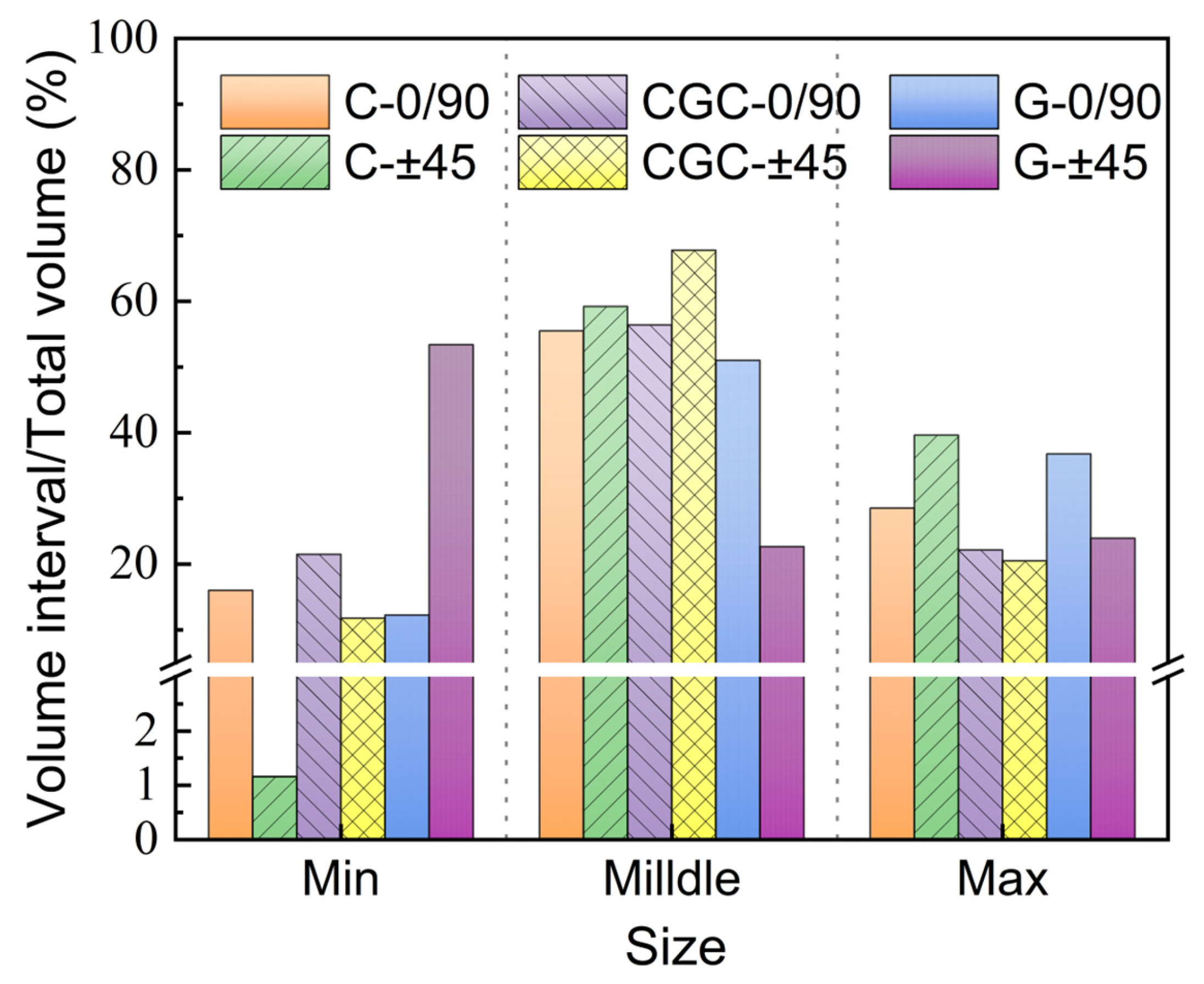 3), with a very high numerical proportion, but their contribution to the overall porosity is limited. This indicates that the defects in carbon fiber composites are mainly in the form of dispersed micro-pores. Carbon/glass hybrid laminates (CGC0/90 and CGC±45) exhibit different characteristics. Although small pores still dominate in number, in CGC±45, the number of medium and large-sized pores (such as >50 × 10