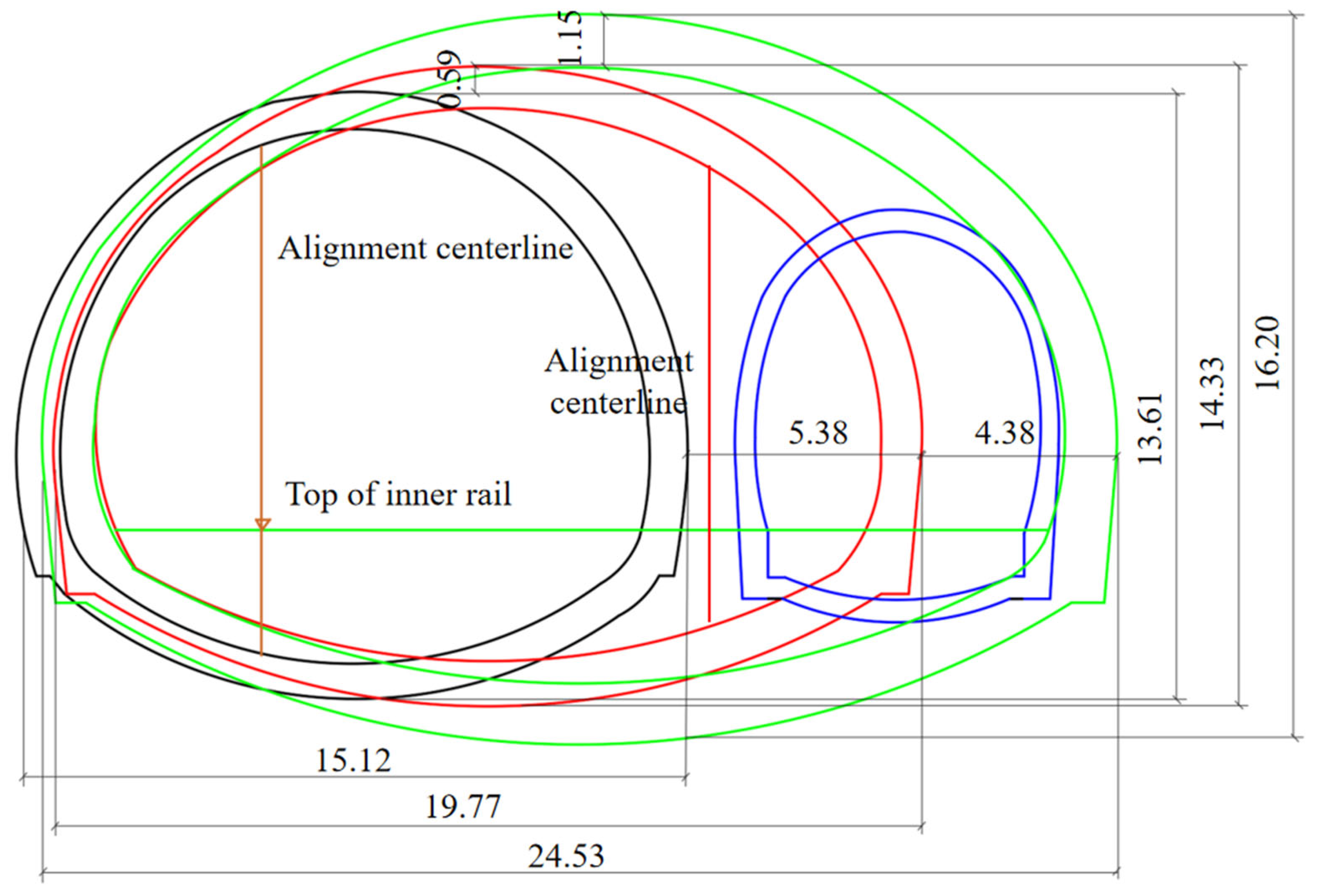 - Xu, Q.W.; Xie, J.L.; Zhou, F.; Tang, Z.H. Numerical Simulation and Analysis of the Causes and Distribution of Secondary Lining Cracks in Overlapping Railway Tunnels. Appl. Sci. 2023, 13, 6436. [Google Scholar] [CrossRef]