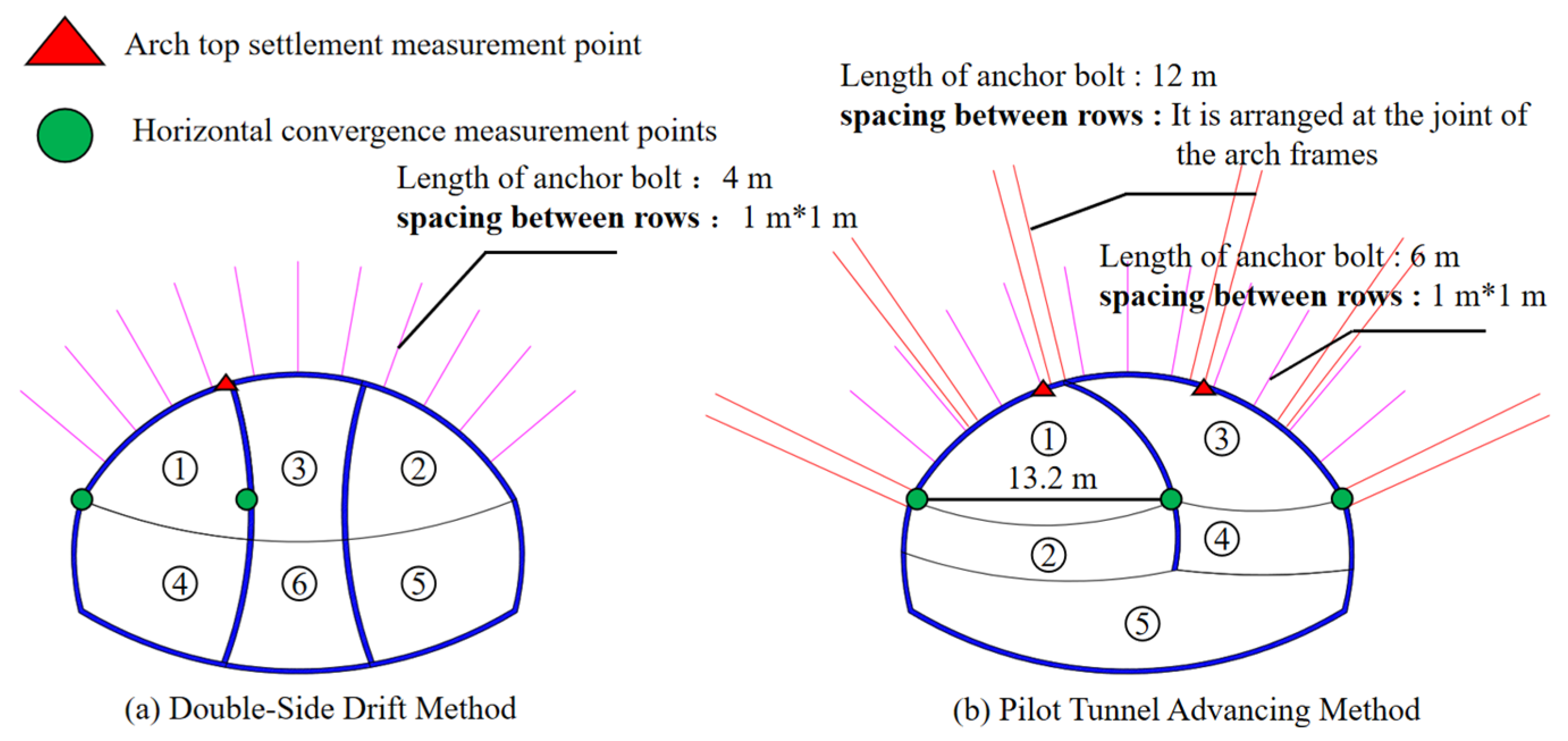 - To facilitate the rapid construction of a large-span tunnel in soft rock under high ground stress, the construction design for a 24.53 m span tunnel in southwestern China was optimized. The traditional double-side drift method was replaced by the pilot-tunnel-first method. Support measures were enhanced by increasing the bolt length from 4 m to 6 m, installing 12 m long reinforced mortar bolts at steel arch frame joints, and strengthening the steel arches themselves. This enabled the preliminary excavation of a 13.2 m large pilot tunnel.