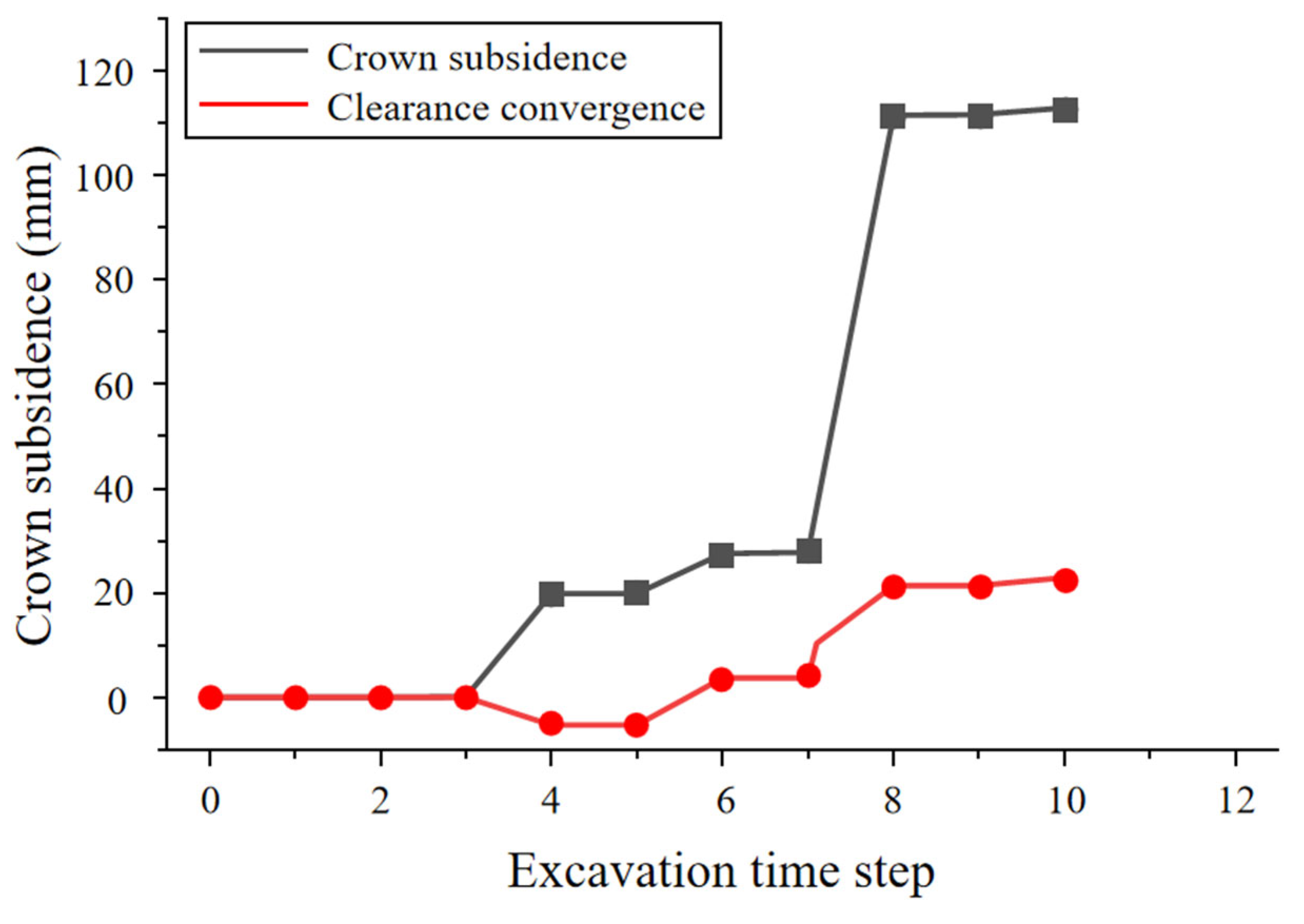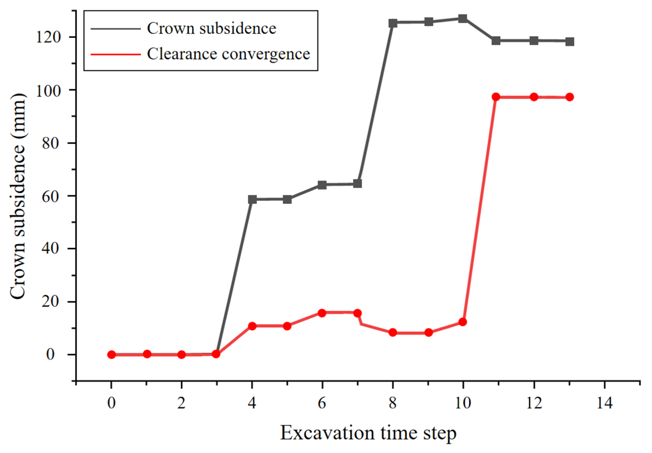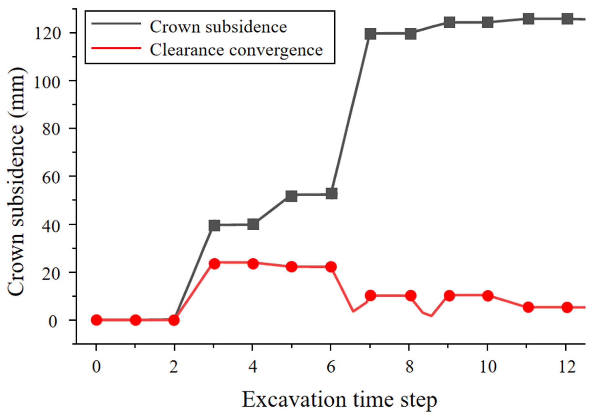 - The numerical calculations and field application demonstrated that the pilot-tunnel-first method, combined with reinforced bolt-lining support measures, achieved a construction quality comparable to the original double-side drift design while significantly accelerating progress. Field monitoring indicated final stabilized vault settlements of 305 mm and 295 mm for the large and small pilot tunnels, respectively, with clearance convergences of 22 mm and 13 mm. For the 123 m advance in the 24.53 m large-span section, the optimized scheme increased costs by approximately CNY 782,000 but reduced the construction period by 1.96 months, substantially alleviating schedule pressure. This research provides theoretical reference and technical guidance for the design and construction of similar tunnel projects.