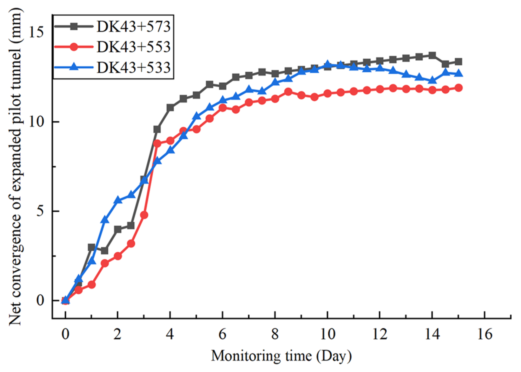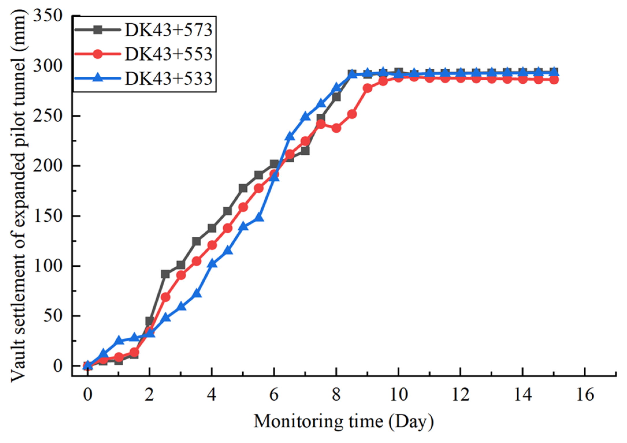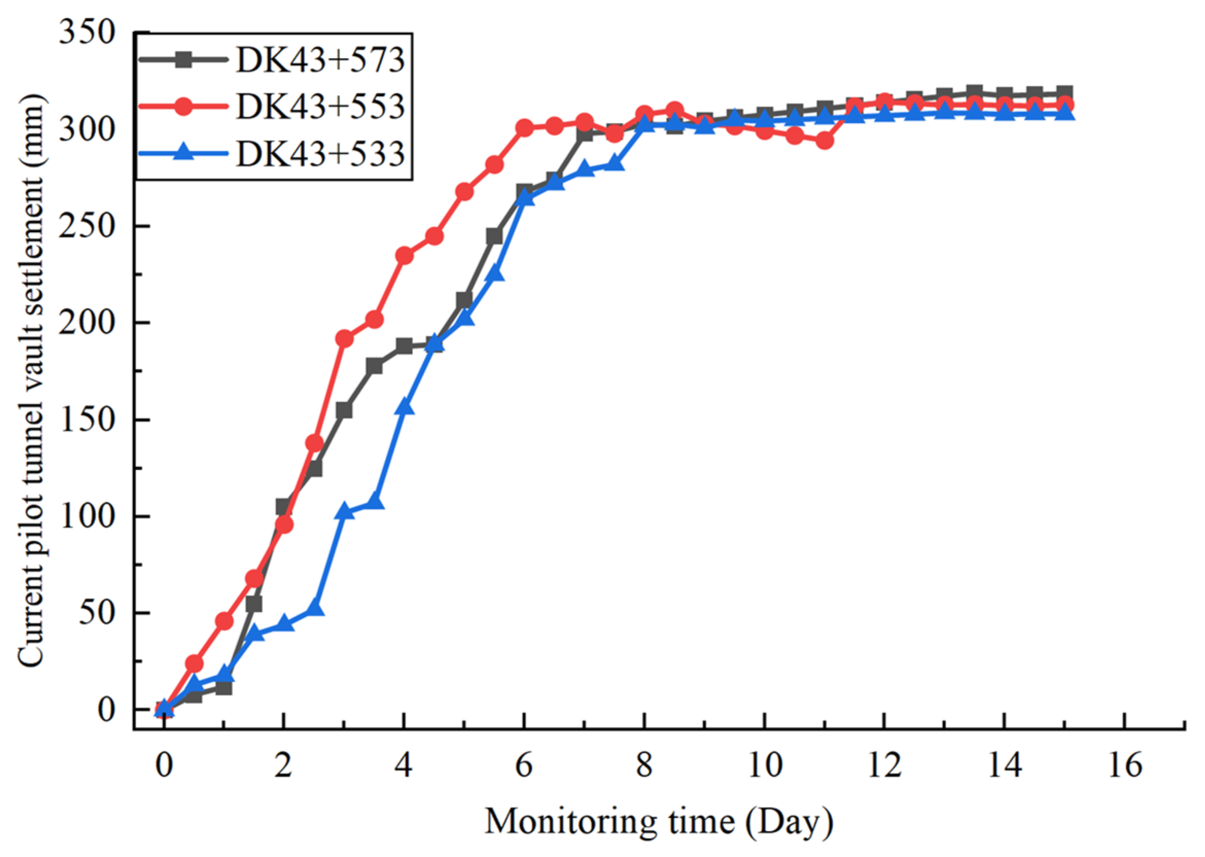 - The section of the tunnel from DK43 + 150 to DK43 + 310 is a large-span segment with three-track divergence on the right side of the right connecting line of a large city railway station in southwest China. The entire large-span segment is 160 m long. At DK43 + 150, the left side remains unchanged while the right side makes a direct turn; the tunnel cross-section abruptly changes from 15.12 m × 13.61 m to 19.77 m × 14.33 m. At DK43 + 257, the tunnel cross-section again abruptly changes to 24.53 m × 16.2 m with a direct right turn. The plan layout of this large-span segment is shown in Figure 1.