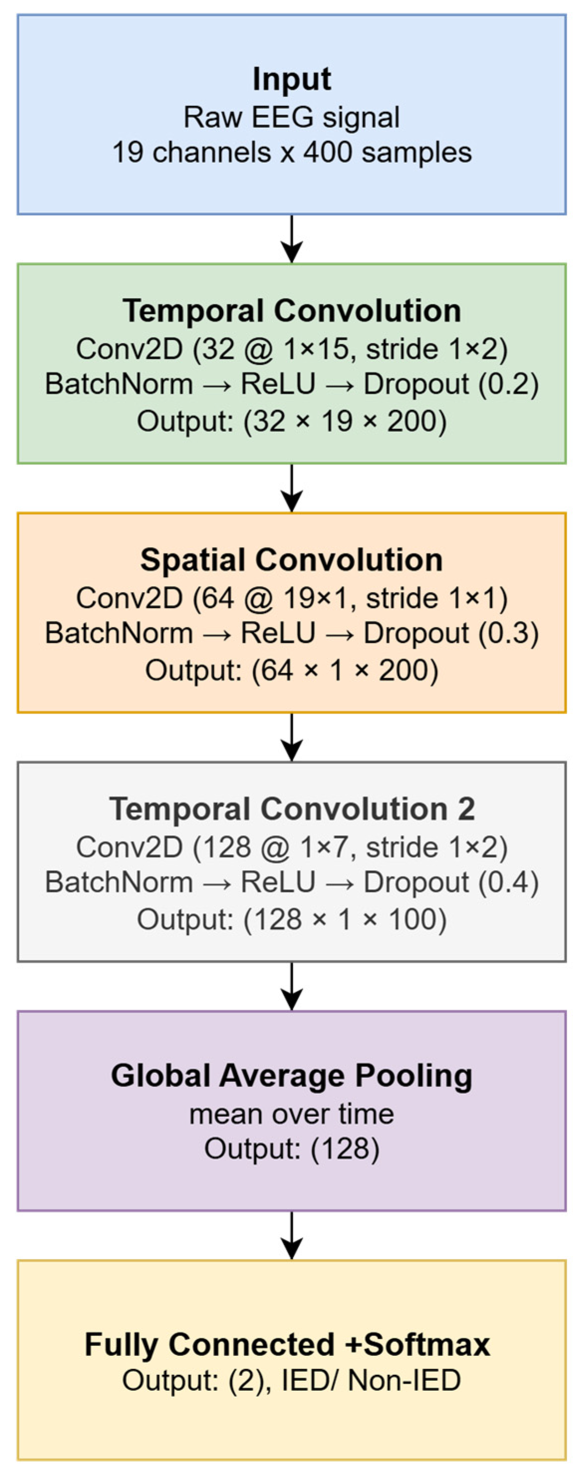 A simple CNN architecture was designed to process multichannel EEG signals with dimensions of 19 × 400 samples (corresponding to 4 s at a sampling rate of 100 Hz). The input layer receives normalized EEG signals, while subsequent convolutional layers extract temporal patterns and spatial relationships across channels. For this study, the input data were labeled as follows: label 0 for epochs without interictal epileptiform discharges (non-IED) and label 1 for epochs containing IEDs. These labels served as the target classes during CNN training.
