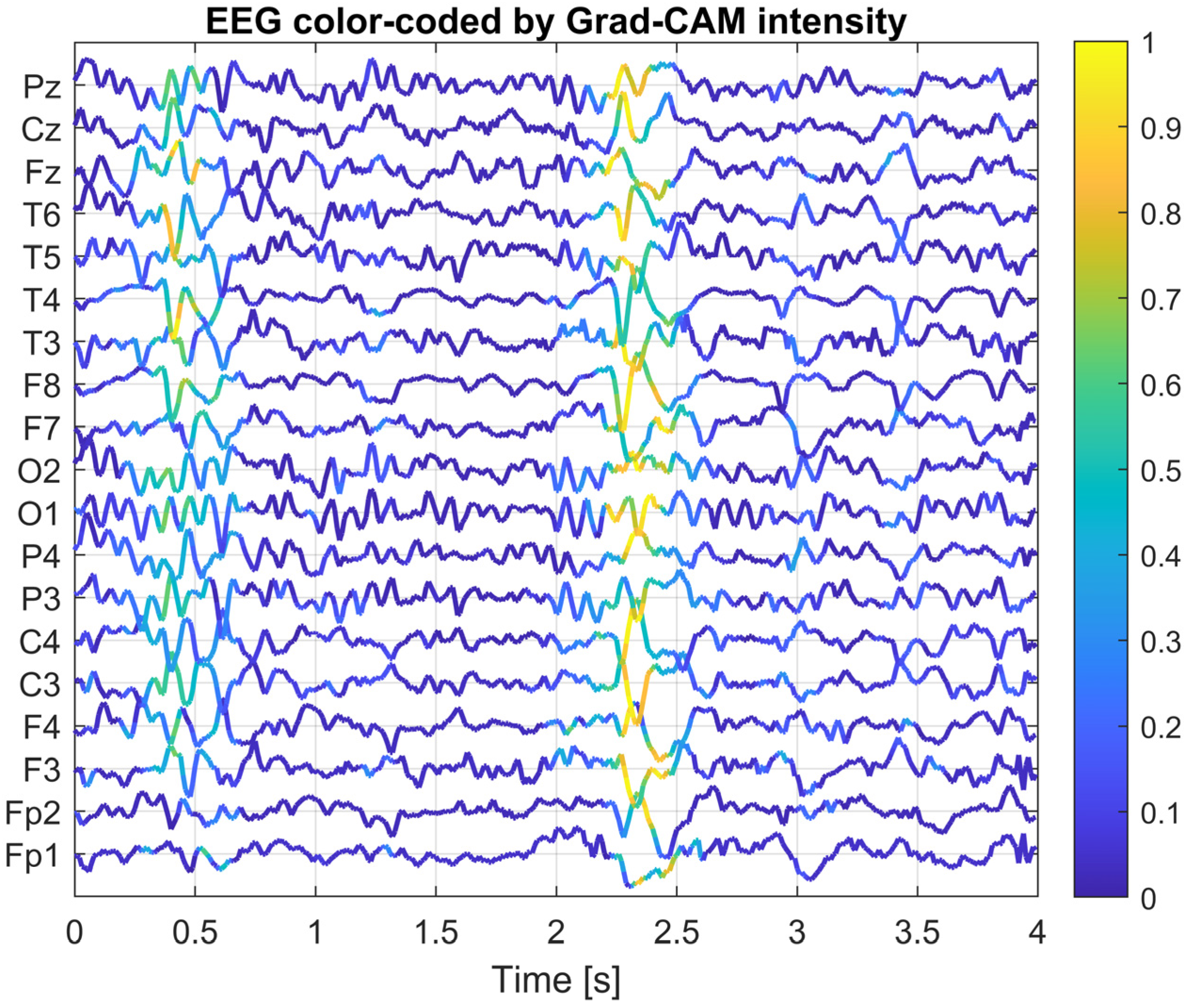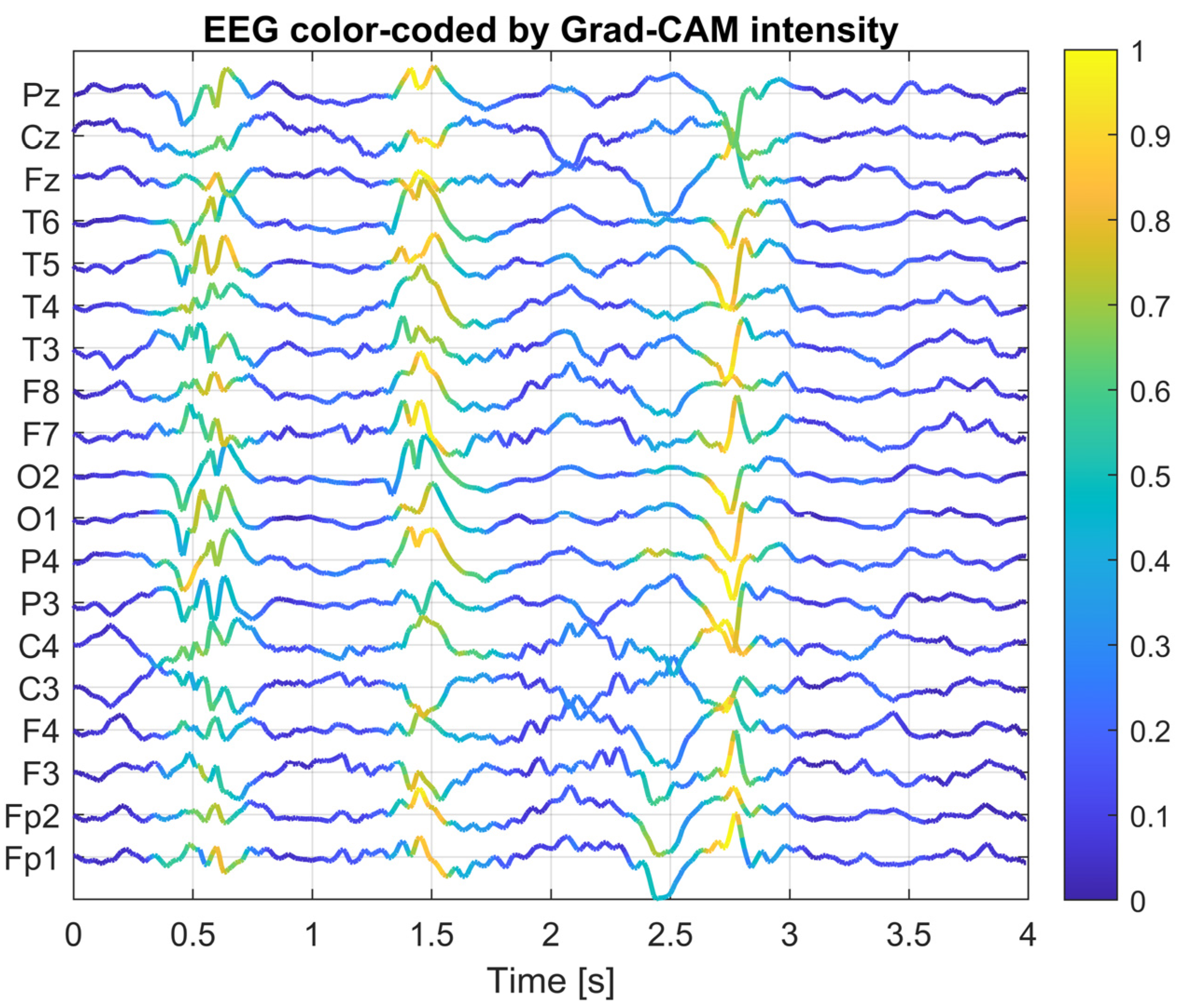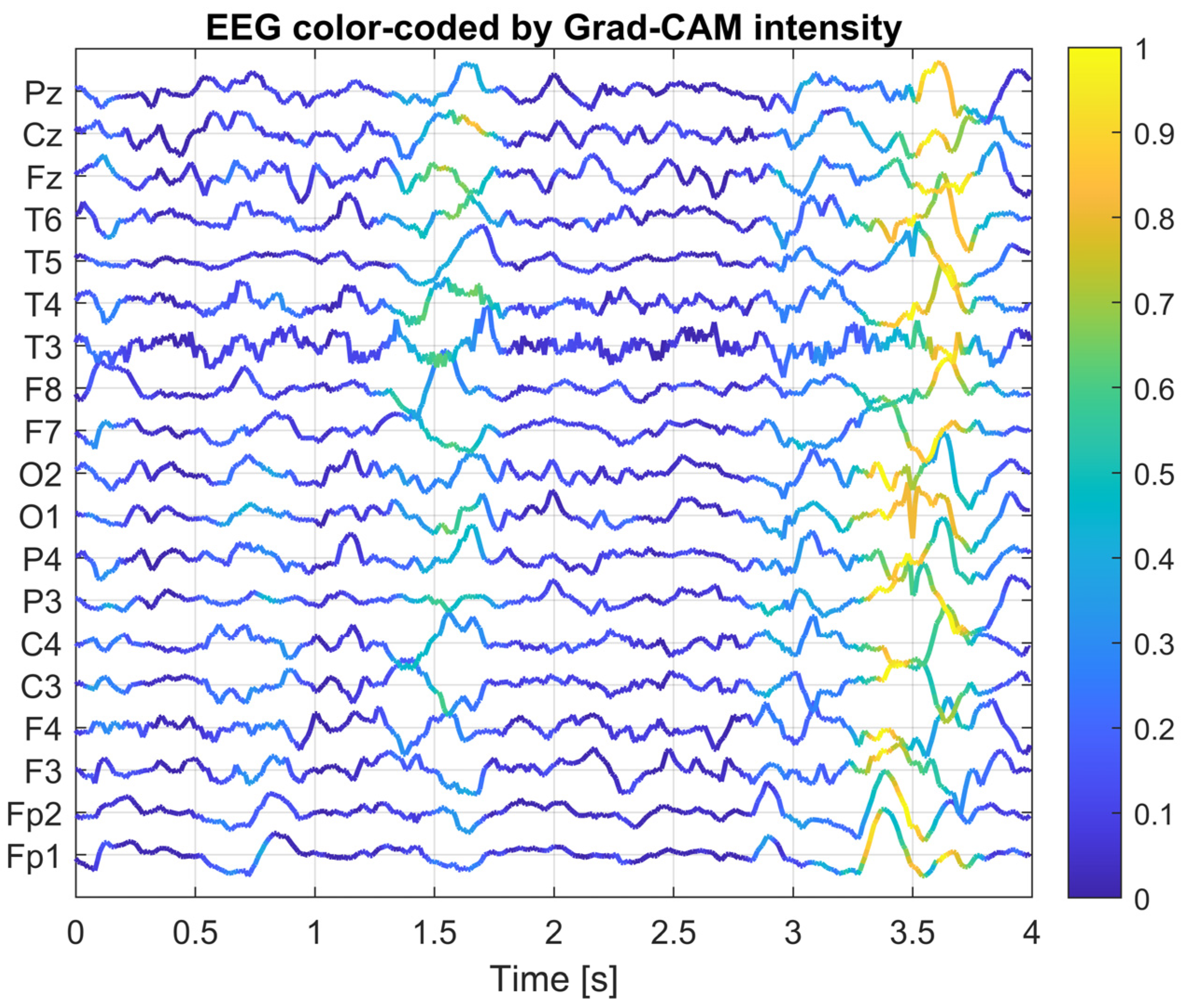 The Grad-CAM method computes the local contribution of gradients from the network output (for the IED class) with respect to the activations of a selected convolutional layer. This produces a two-dimensional activation map, where the intensity of each value reflects the importance of a given location in the EEG signal for classification. In this study, the last convolutional layer of the network was chosen as the reference layer, as it is responsible for detecting complex temporal patterns after prior spatial integration. This layer has the most significant impact on the final classification outcome, as it aggregates information about the temporal dynamics and spatial topology of the signal following earlier filtering stages. For selected EEG segments, composite plots were generated, where the color intensity of each EEG channel over time was proportional to the corresponding Grad-CAM activation value. This allows for simultaneous visualization of both the EEG waveform and its relevance to the model’s decision-making process.