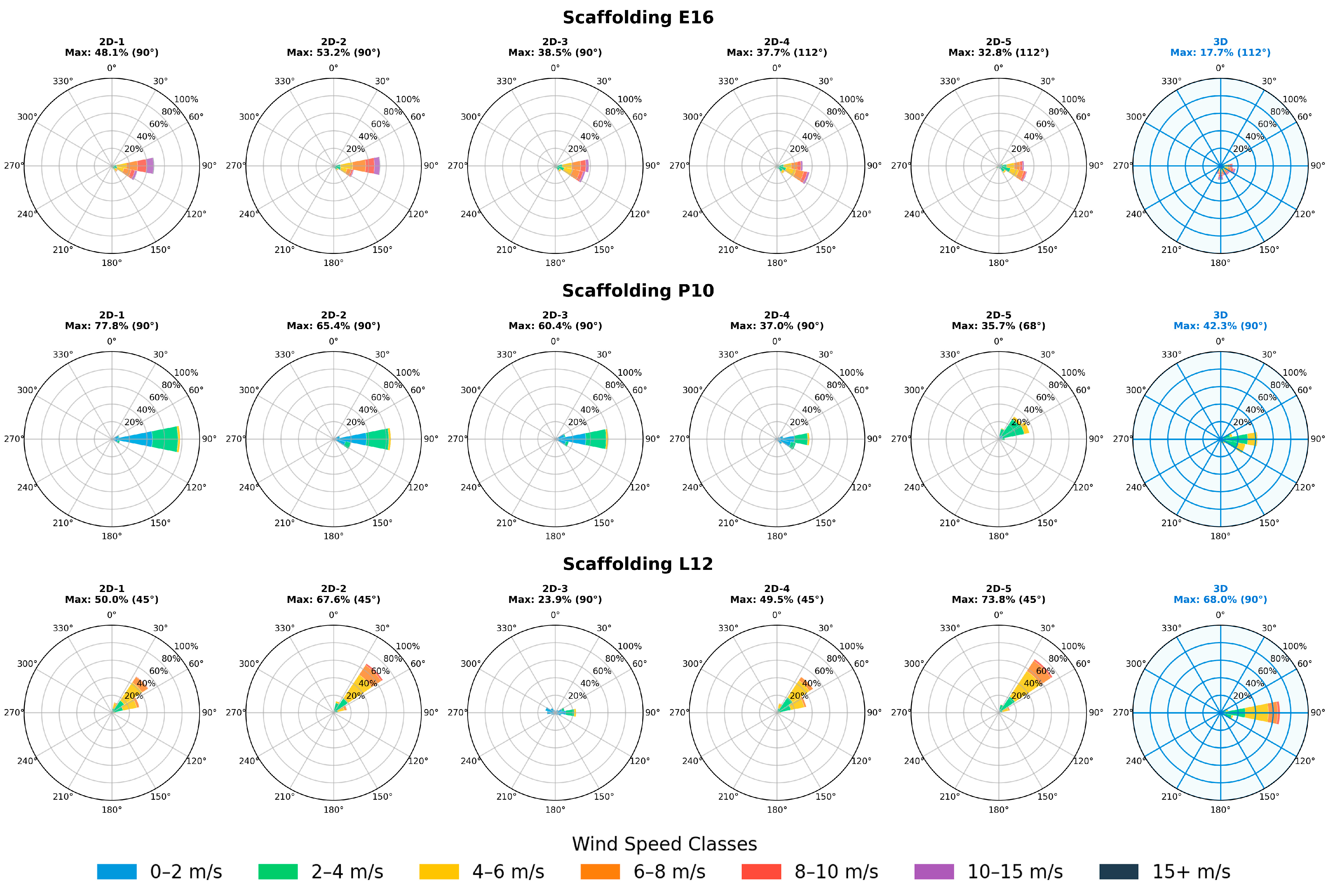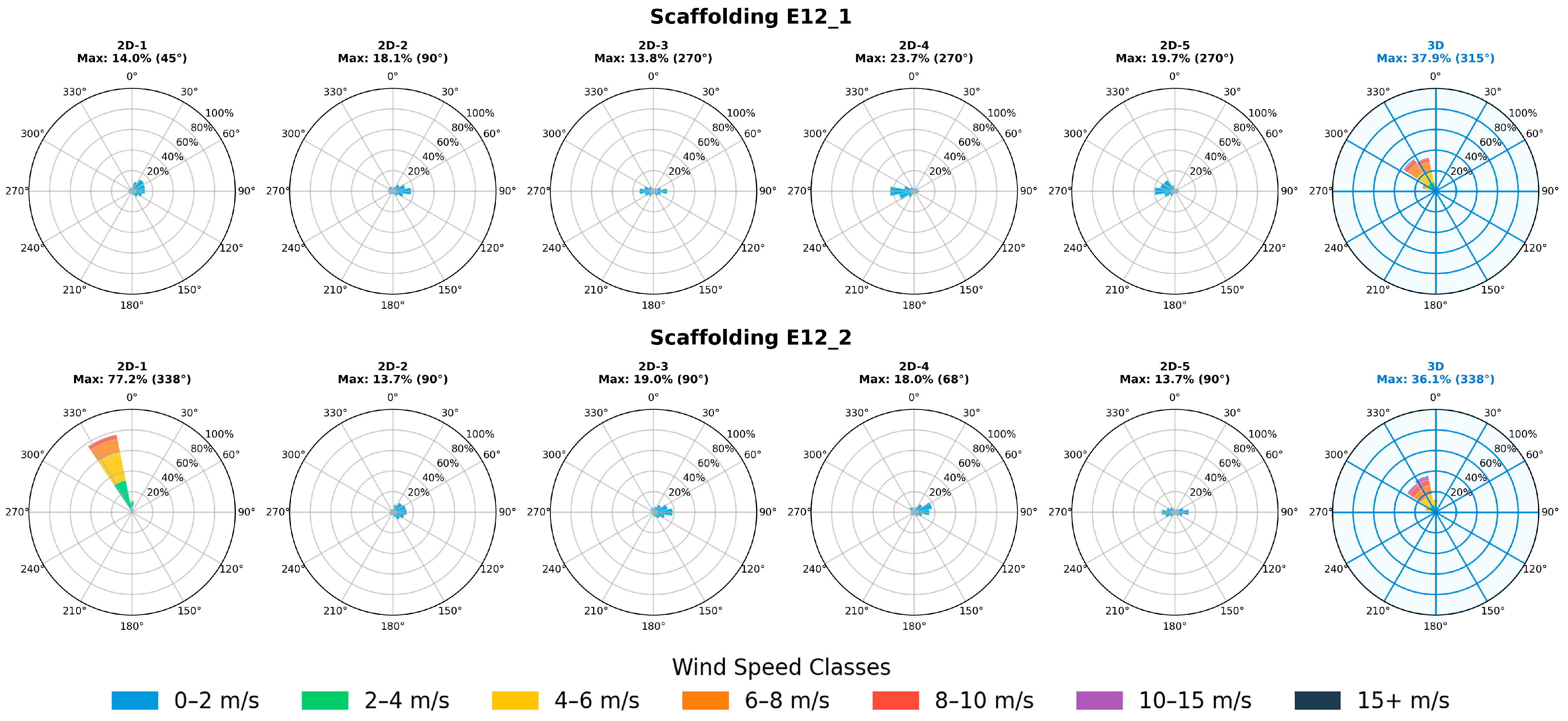 - Wind velocities across scaffold surfaces exhibit extreme spatial variability. The squared velocity ratios ranged from below 0.1 in sheltered mid-façade positions to above 1.0 at windward corners and edges. Flow acceleration occurs at exposed corners and edges, while mid-façade and recessed zones experience velocity reduction and strong directional deviations due to boundary layer and flow separation effects.