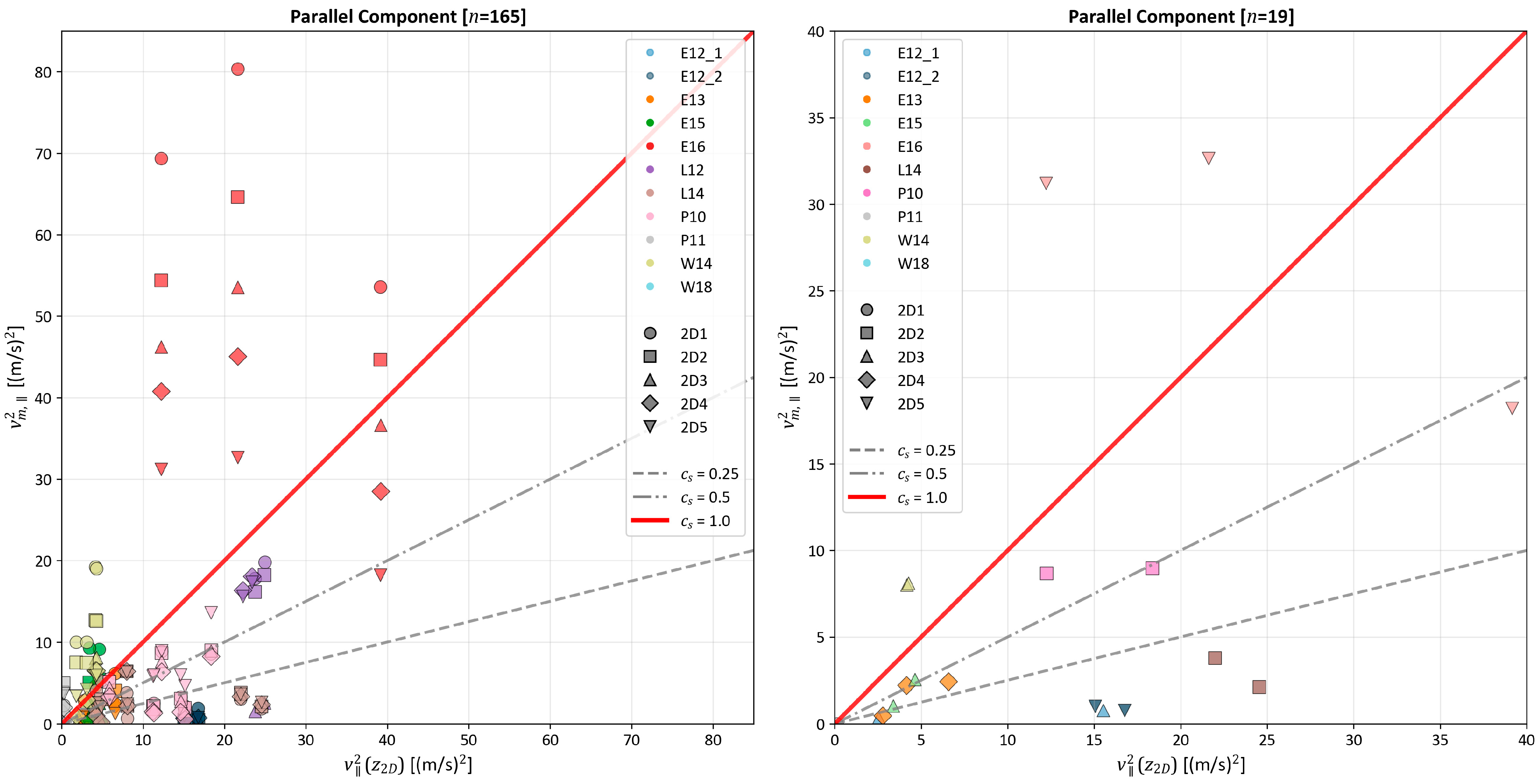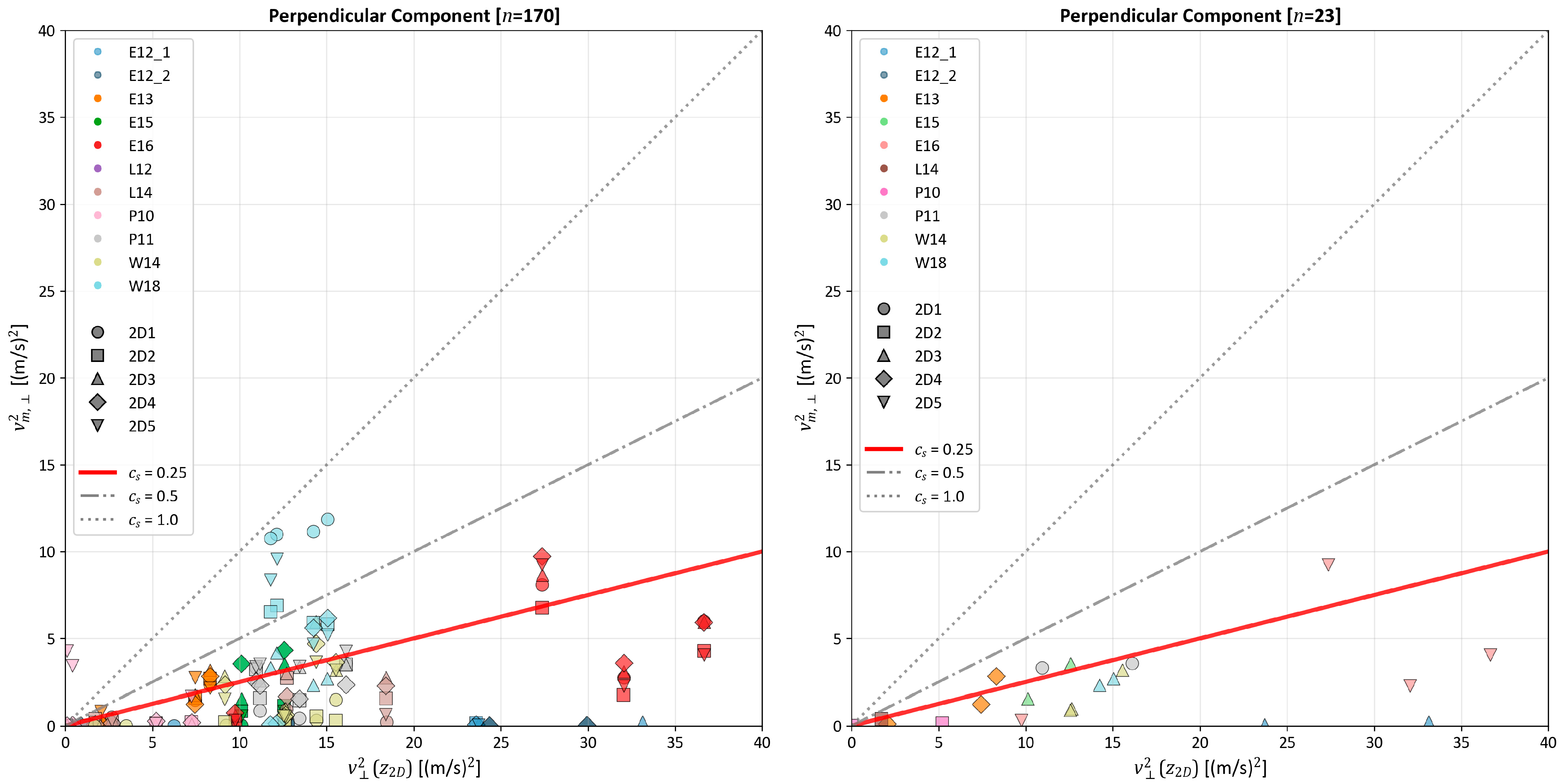 - The parallel flow component exhibits substantial scatter and site-dependent variability, whereas the perpendicular component is strongly damped by the façade presence and netting. Mid-façade perpendicular velocities were generally below the normative reference. Edge and corner positions remained exceptions due to local acceleration effects.