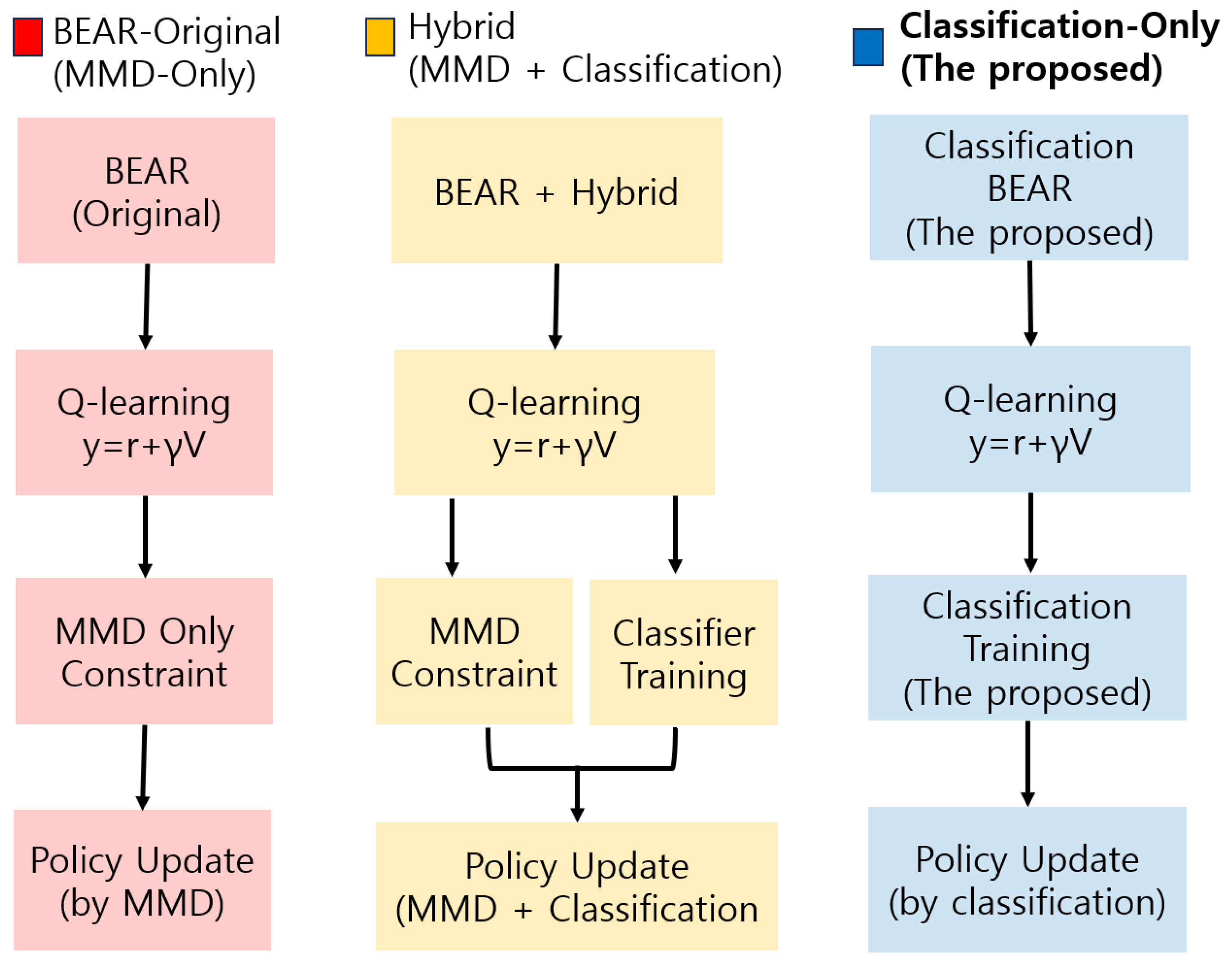 | Aspect | Conservative (CQL, IQL) | Distributional (BEAR, BRAC) | This Study (Classification-BEAR) |