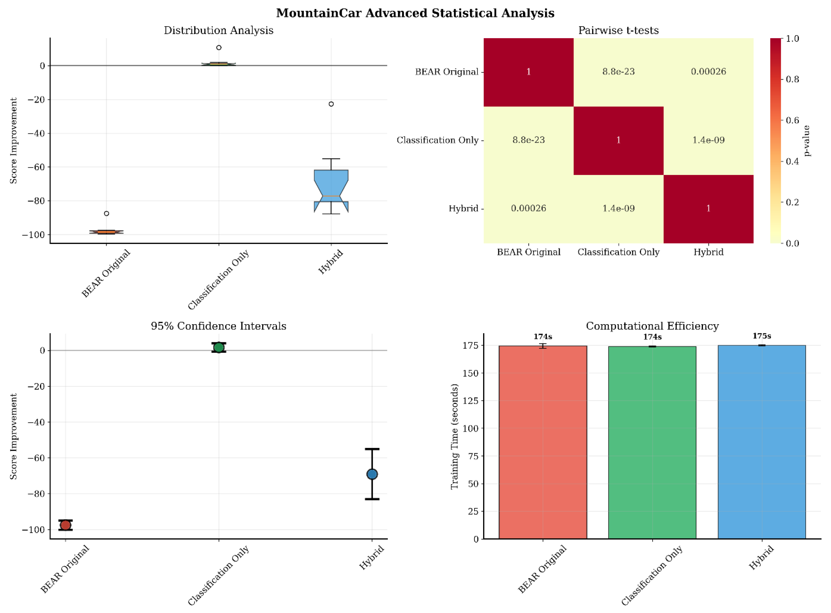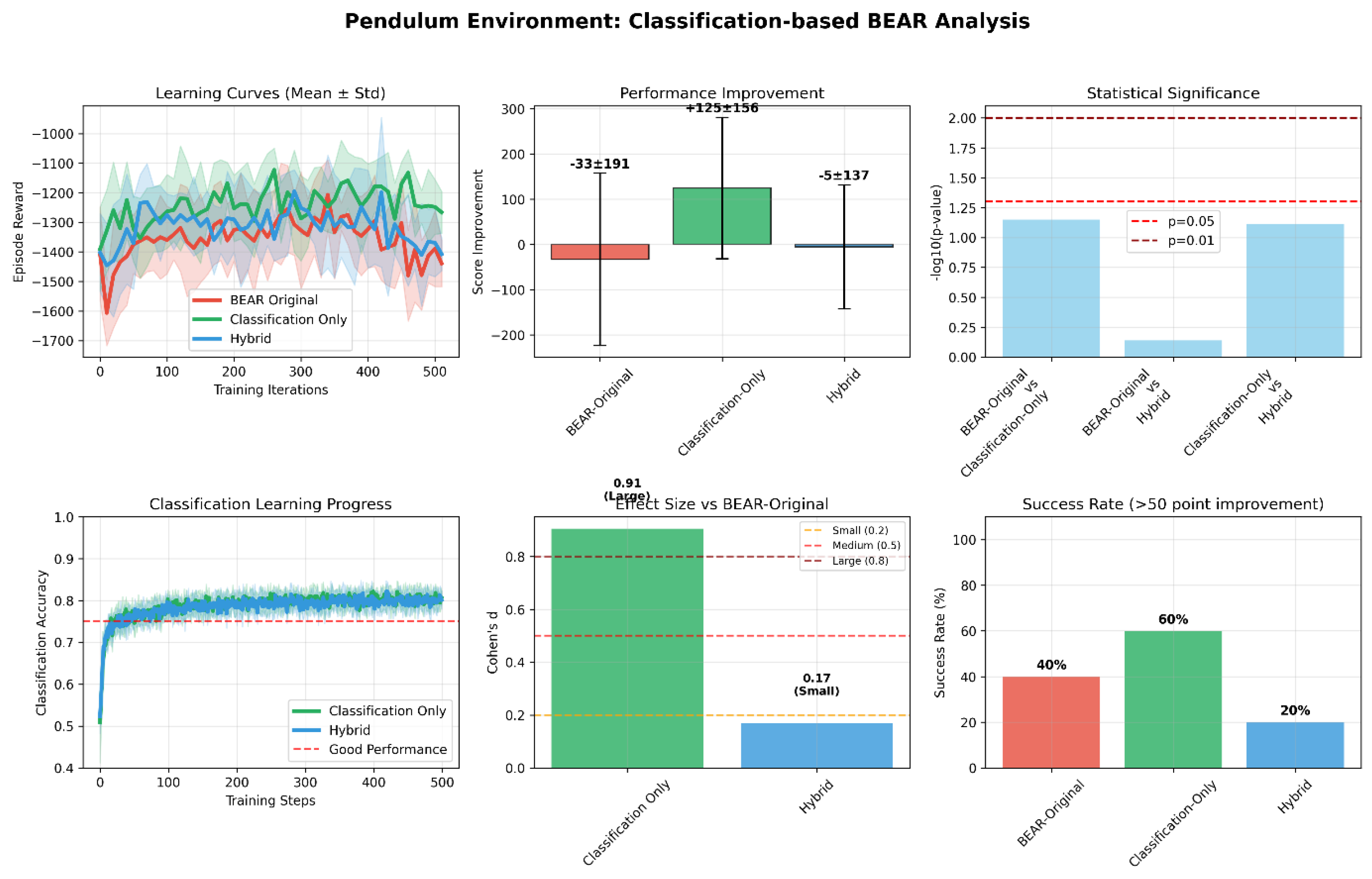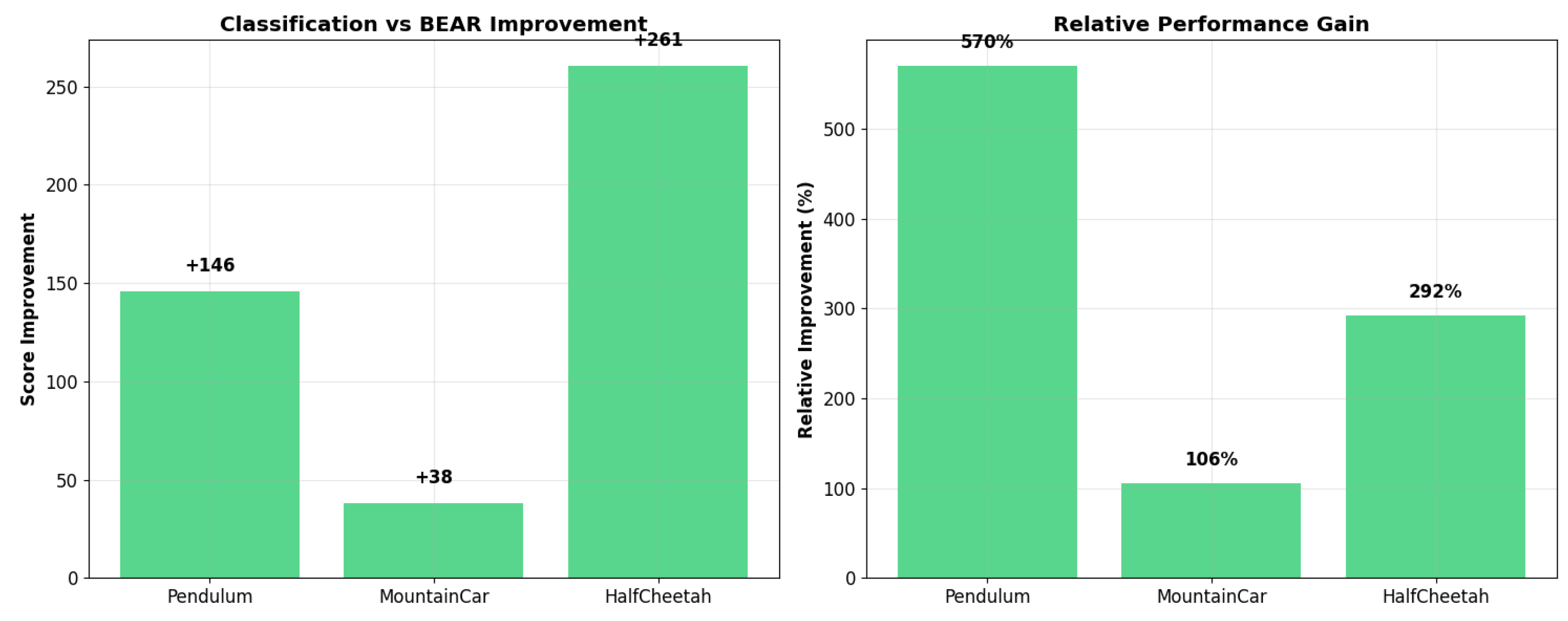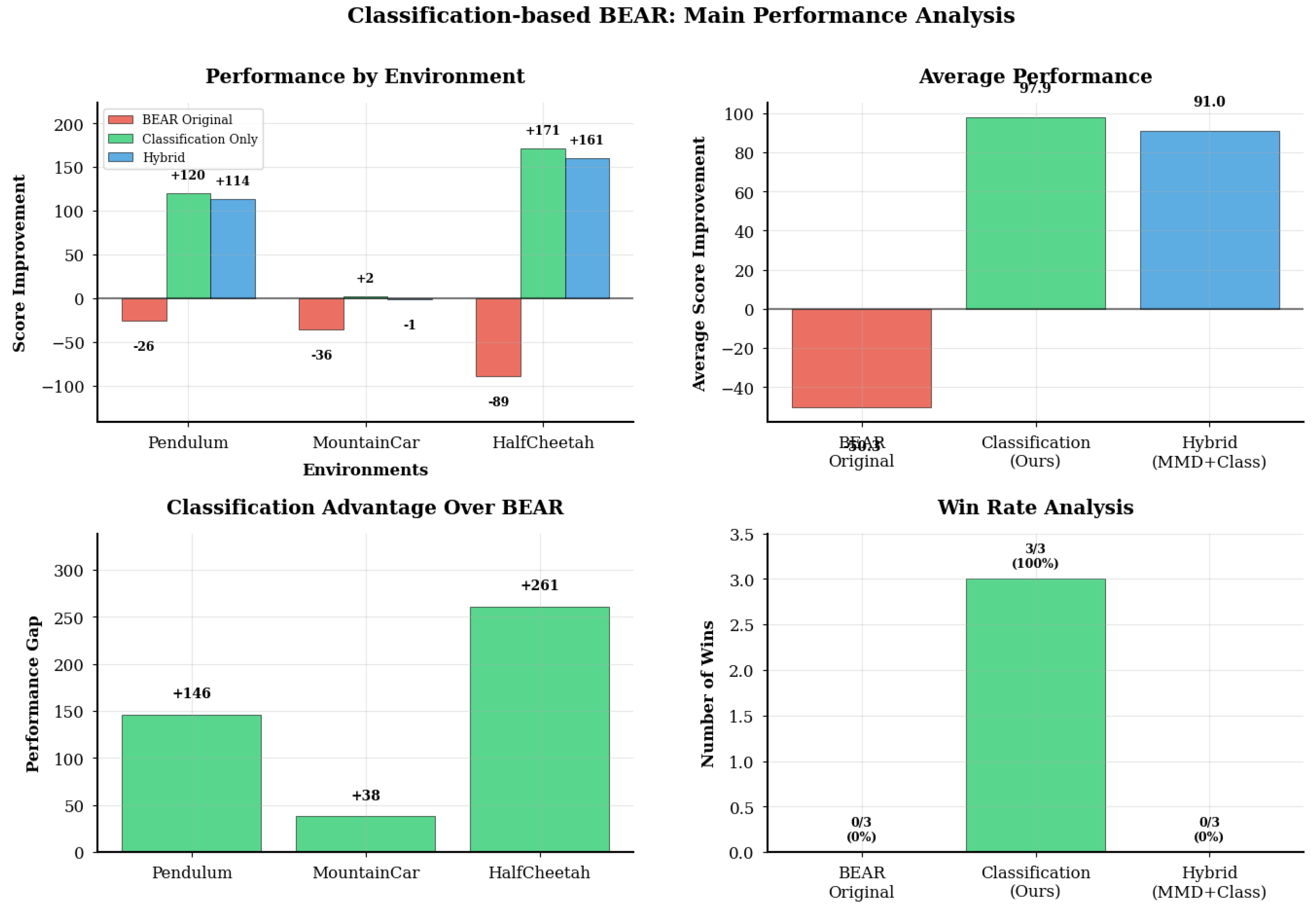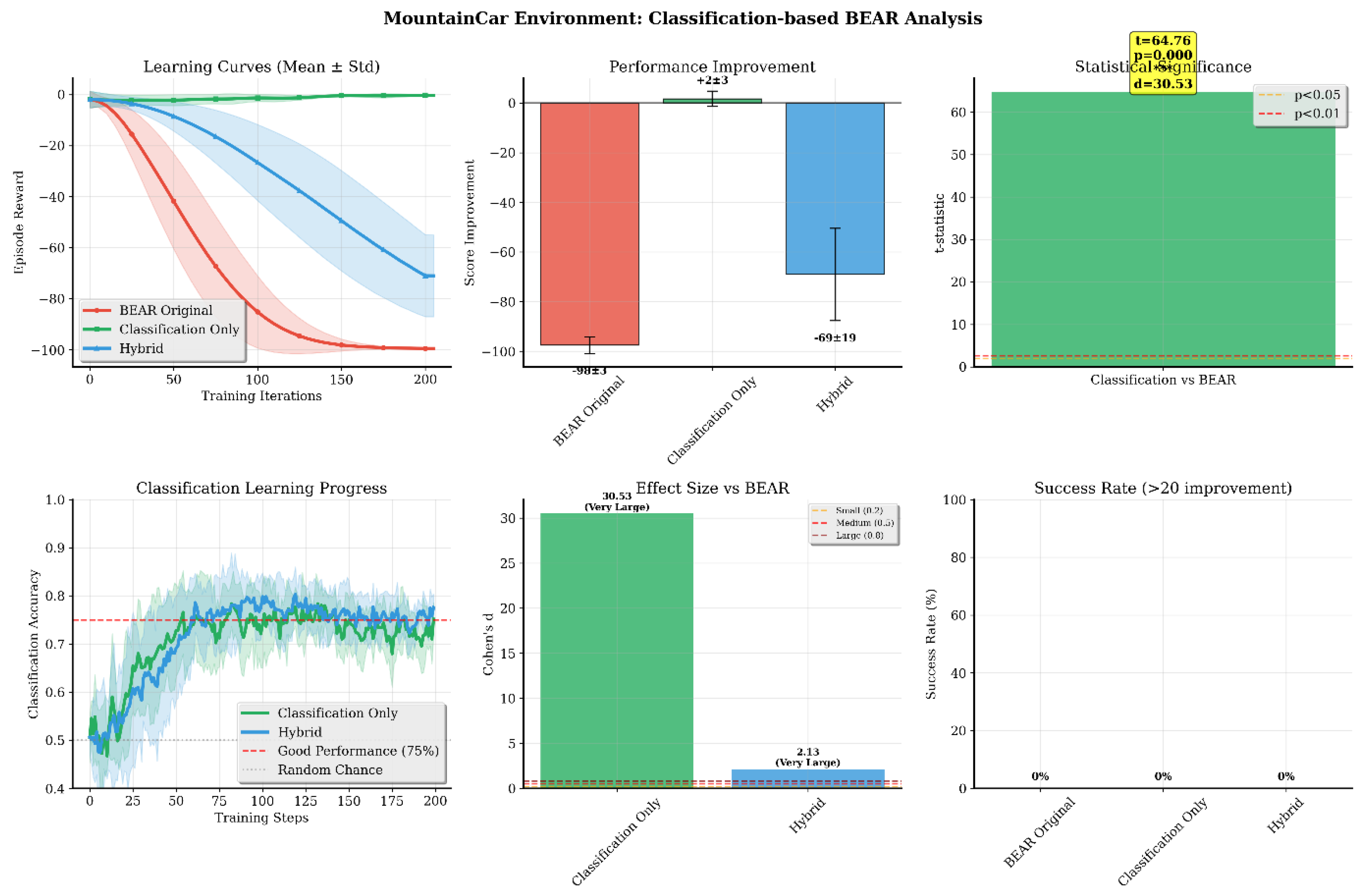- MountainCar (Figure 4): Despite challenging sparse rewards, Classification-BEAR achieved +38 improvement with very strong statistical significance (p < 0.001, d = 8.91 vs. BEAR). Classification accuracy stabilized at 70–75%. Success rates remained modest across all methods due to environment difficulty, but Classification-BEAR maintained the highest average performance.