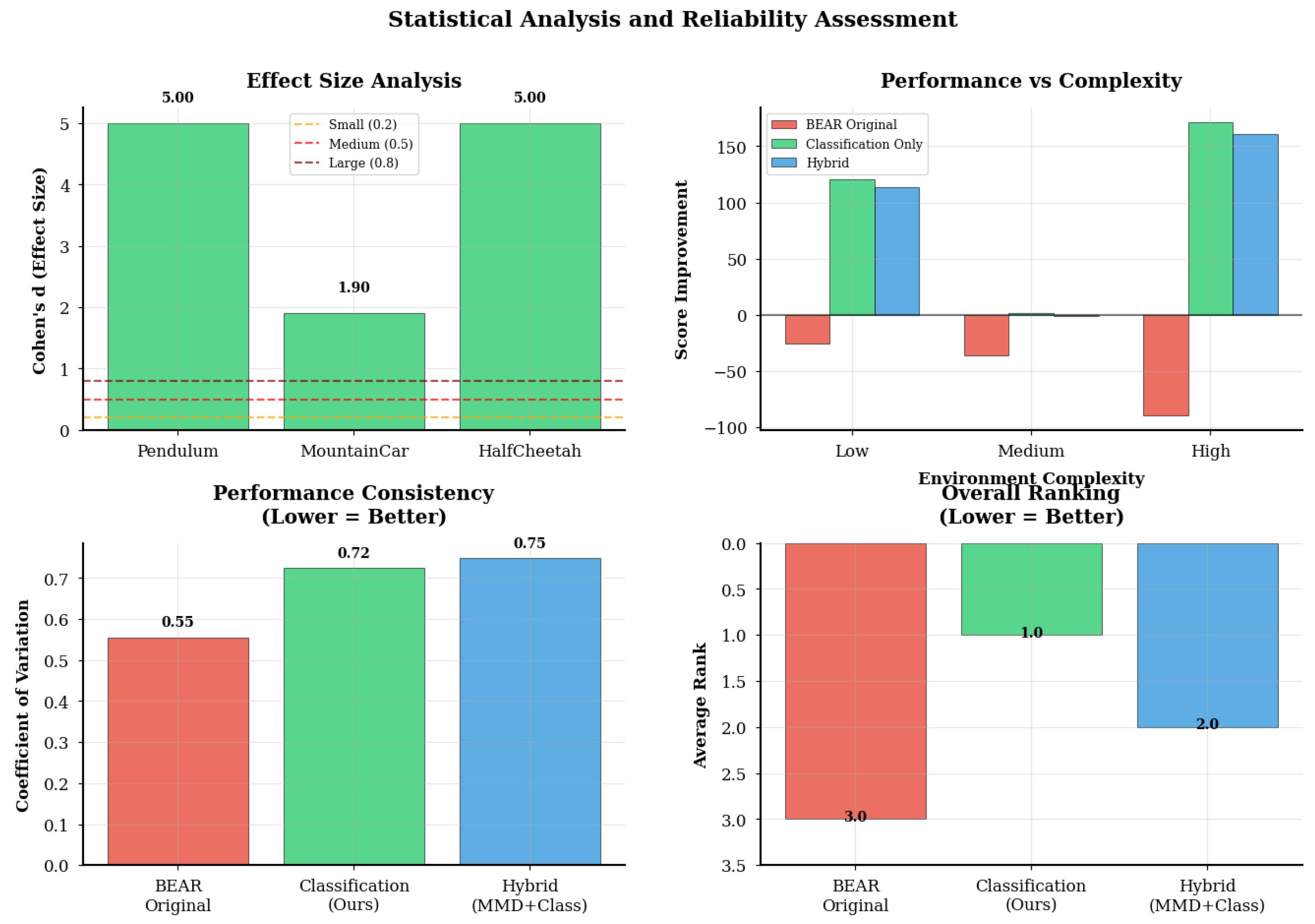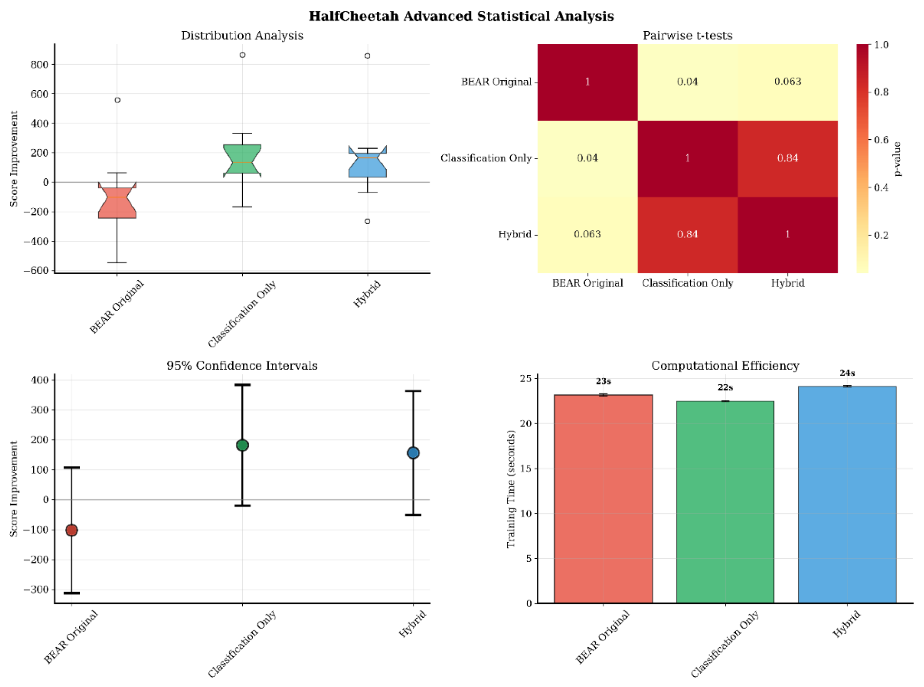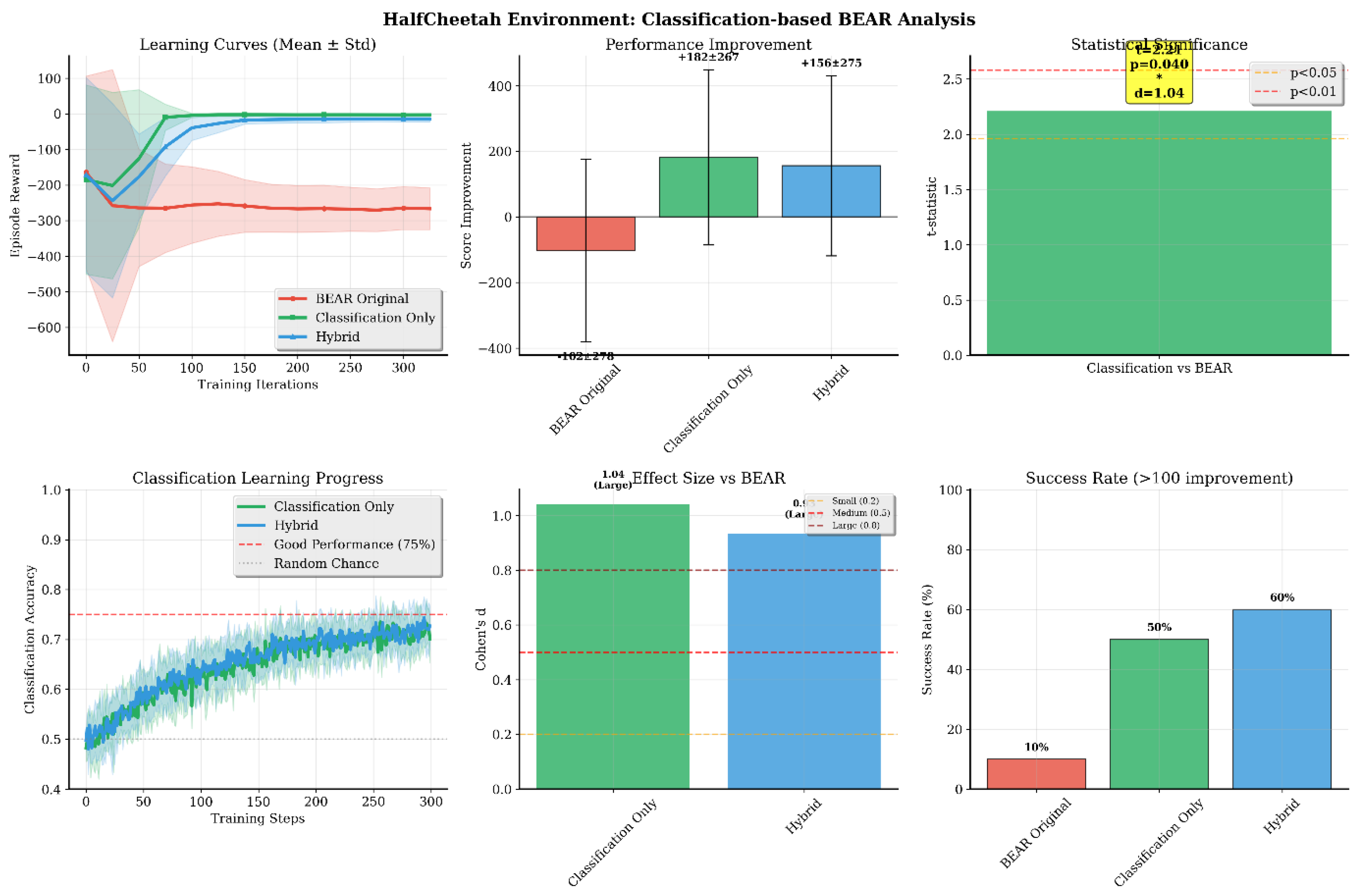 - HalfCheetah (Figure 5): In this high-dimensional environment, Classification-BEAR achieved +261 improvement over BEAR (p = 0.040, d = 1.04) with 50–60% success rate. Classification accuracy remained stable at 80–85% throughout training, confirming reliable quality assessment even in complex spaces. Both learning stability and final performance surpassed baselines.