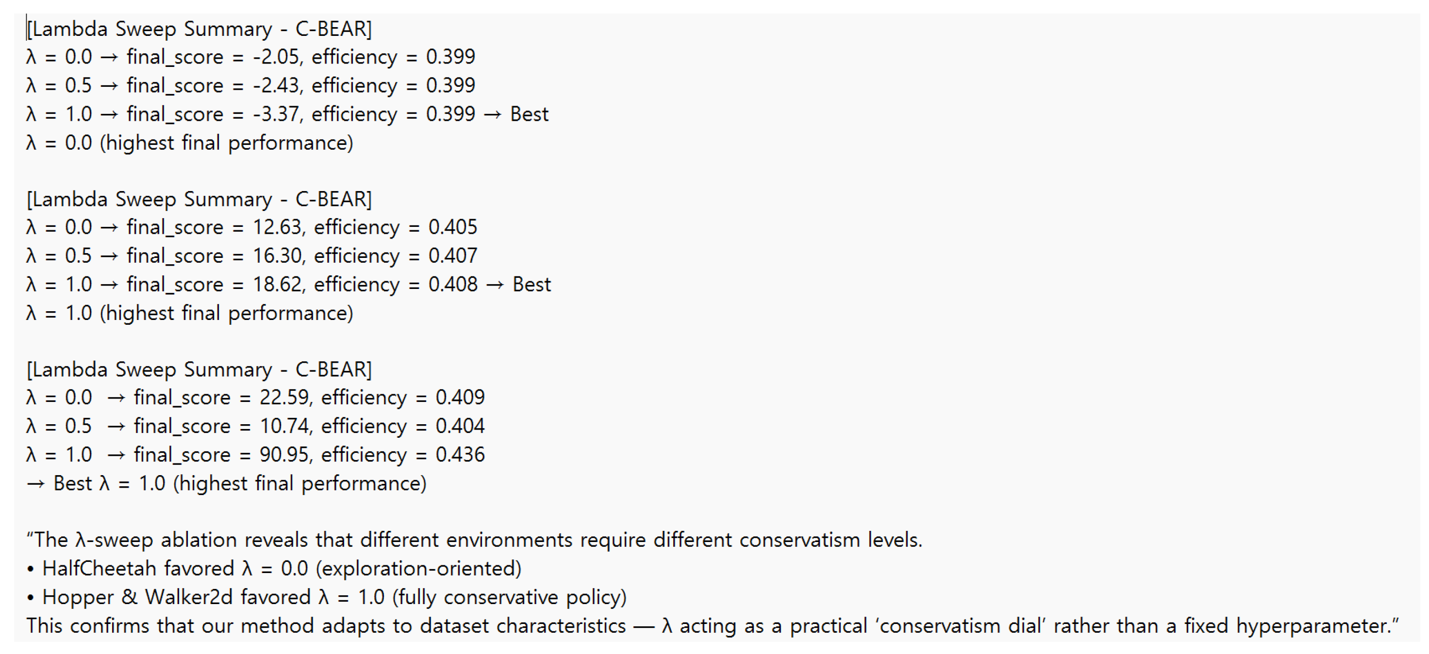 | Environment | λ Value | Final Score | Efficiency Score | Interpretation |