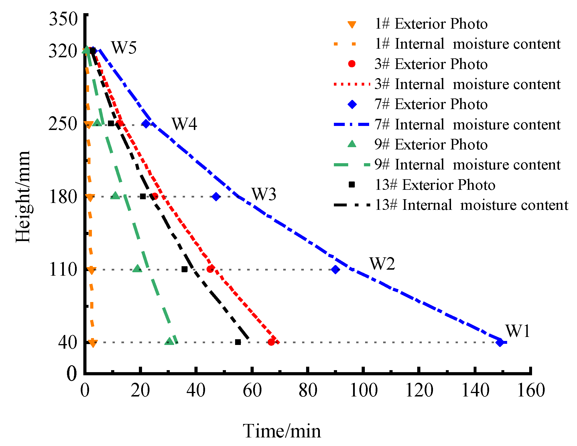 - When the initial water content of the soil is high, the color difference between the soil ahead of and behind the wetting front surface is minimal, making external observation of the wetting front difficult. In such cases, the position of the wetting front can be monitored by identifying the time when saturation reaches 50% to 70%, with a relative error between the two methods of less than 7%.