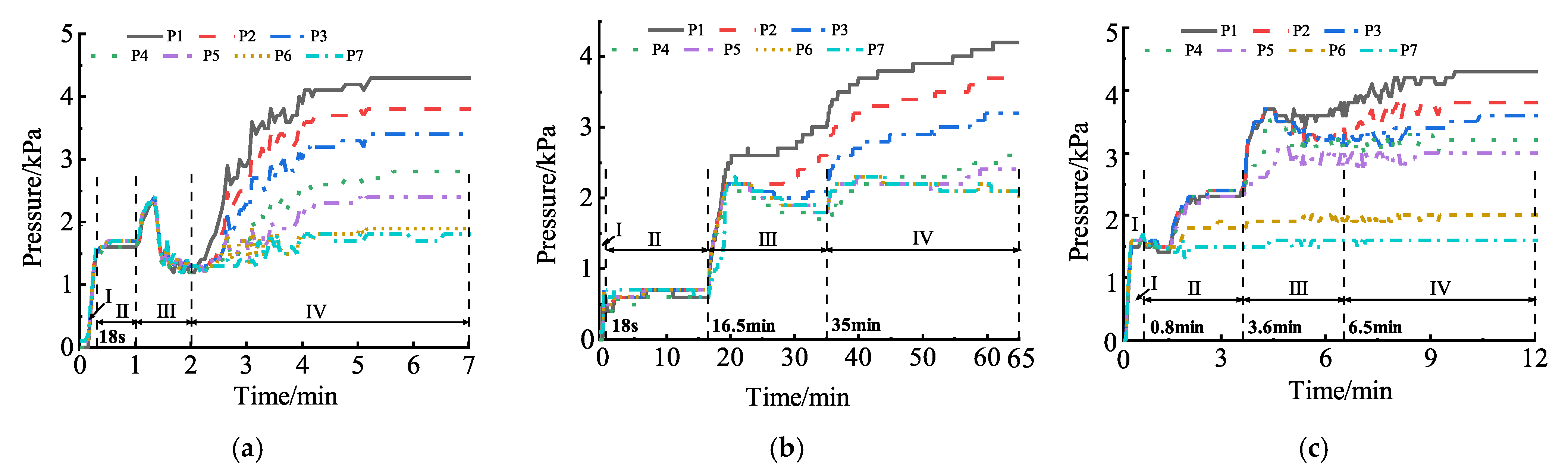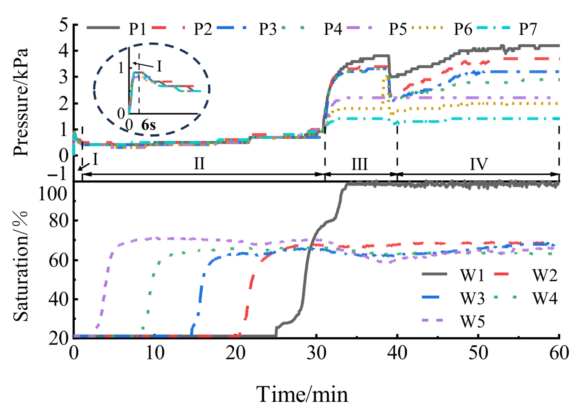 - Stage I: Pressure soars under ponded water applied. This stage occurs instantaneously upon the application of a water head. Owing to the initial unsaturation conditions and enclosed boundary, air phase was entrapped in the soil column. Upon application of the water head, the pressure readings from the P1 to P7 sensors all rose simultaneously within an extremely short time from 0 kPa to 1.0 kPa. The selected time span of Stage I (i.e., 30 s, 18 s, 24 s, 6 s, 18 s, 15 s, 12 s, 48 s, 24 s, and 36 s) is statistically analyzed. The average value is 23.1 s and the standard deviation is 12.3 s. The measured pore pressure is pore air pressure which reflects the top-layer pore water pressure resisted by pore air pressure. This phenomenon occurs because the wetting front advances rapidly downward immediately after water head application, forming a water column of approximately 100 mm that transmits pressure to the sensors. Under this depth, the continuous air phase is compressed by the infiltrating water phase, forming a transient air pressure barrier that hinders the further rapid infiltration of the water phase. Since the W5 sensor is located approximately 150 mm from the water head surface, no water content change is detected during the first stage. Overall, the first stage is characterized by a linear increase in internal pore air pressure within the soil column following the application of a ponded water boundary at its top, driven by the transmission of external pressure.