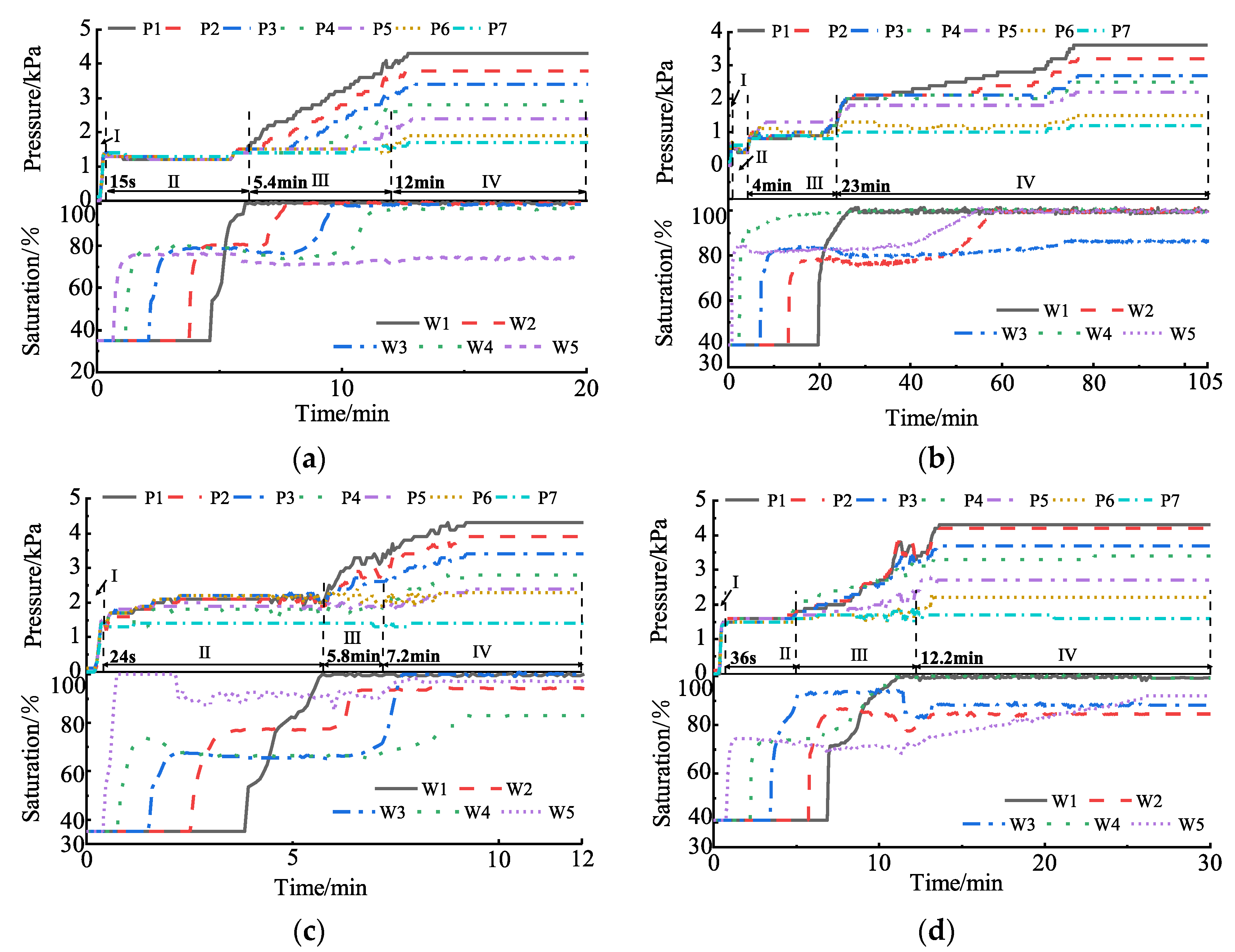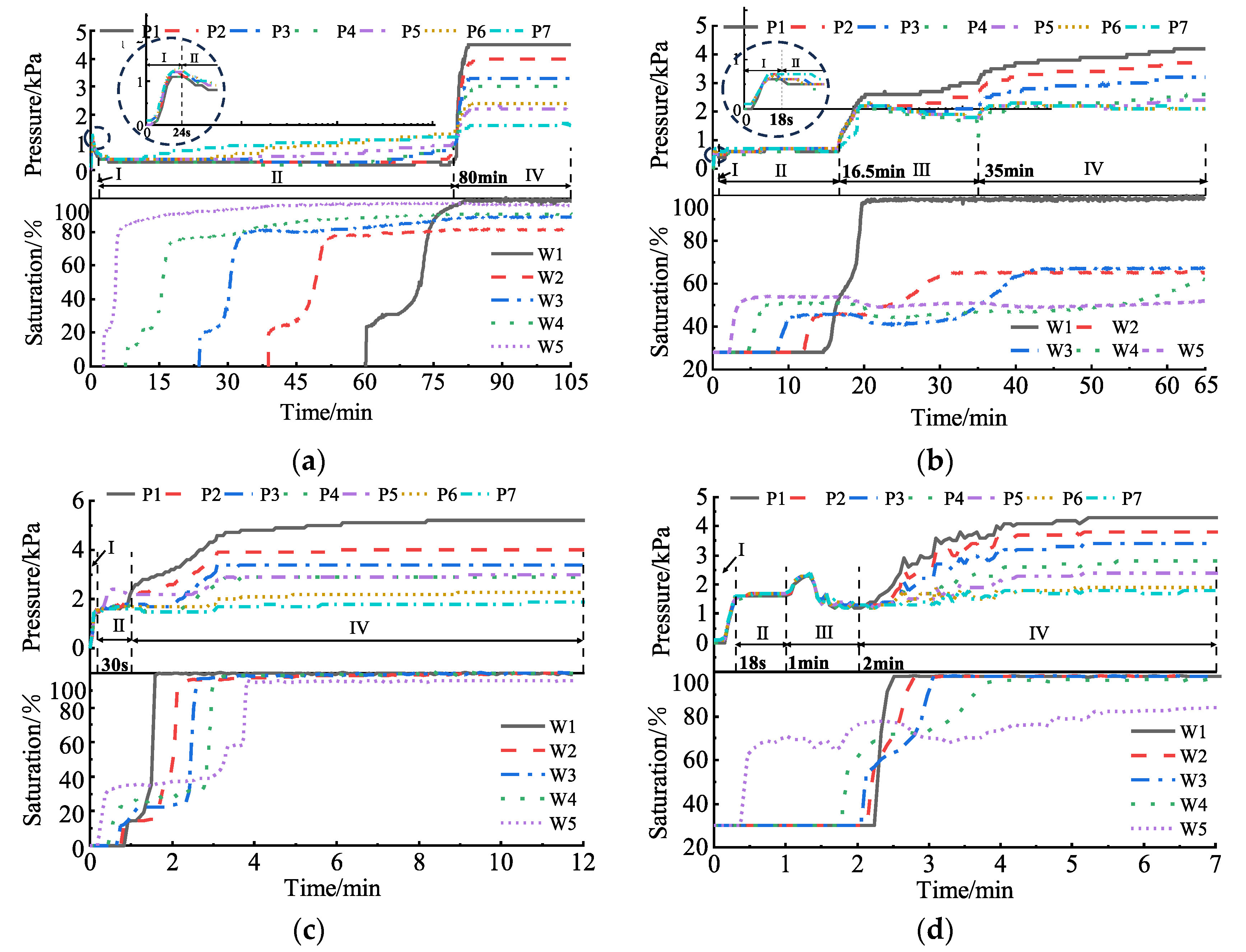 - Stage III: Pressure surging with air breakthrough. This stage is generally characterized by the air bubbles releases from soil and pore air pressure as fluctuation with the wetting front approaching the bottom of the soil column. During this stage, the pore air pressure first increases; once it reaches a certain critical value, it decreases rapidly by a certain margin. The drop of pore pressure is statistically analyzed by selected test cases. Excluding the cases of none Stage III, the typical air breakthrough pressure drop is listed as 1.2 kPa, 1.8 kPa, 0.5 kPa, 0.2 kPa, 0.9 kPa, 0.3 kPa, and 0.4 kPa. The average value of these data is 0.8 kPa, and the standard deviation is 0.6 kPa. As the air counterflow passes the upper volumetric water content sensor, the measured saturation also has a mild response. It first decreases slightly locally and then increases. Analysis of the W1 curve indicates that the saturation of the soil sample near the W1 water content sensor had approached 80% before the start of Stage III, meaning the wetting front had already neared the bottom of the soil column prior to this stage. Due to the imposition of a certain initial saturation, the soil column contained a certain amount of confined air bubbles before the application of the water head. In Stage II, the pressure within the soil had not yet reached the threshold for bubble emission, so the air moved toward and accumulated at the bottom under the drive of the wetting front. As the wetting front advanced close to the bottom of the soil column, the air pressure reached the critical value (the air pressure required to drive entrapped bubbles to break through the water phase and escape from the soil column), causing the confined air bubbles at the bottom of the soil column to be expelled outward under internal pressure, which hindered the infiltration of the water phase. Meanwhile, as the confined bubbles were expelled, the water phase rapidly filled the voids left by the bubbles, leading to a certain decrease in pressure at the end of Stage III. With the further advancement of the wetting front, the confined bubbles at the bottom were pushed upward by the water phase, resulting in a slight decrease in saturation. After some bubbles were expelled, the water phase filled their voids, leading to a certain increase in saturation. However, due to the relatively high proportion of fine particles in the S2 soil sample, it is difficult for bubbles to escape on a large scale, and they only migrate slowly in the form of dispersed small bubbles. Thus, the fluctuation in saturation is hard to identify. In the case #4, the saturation of W5 during this stage—approximately 65% at 32 min, 57% at 38 min, and 66% at 40 min—can confirm this conclusion.