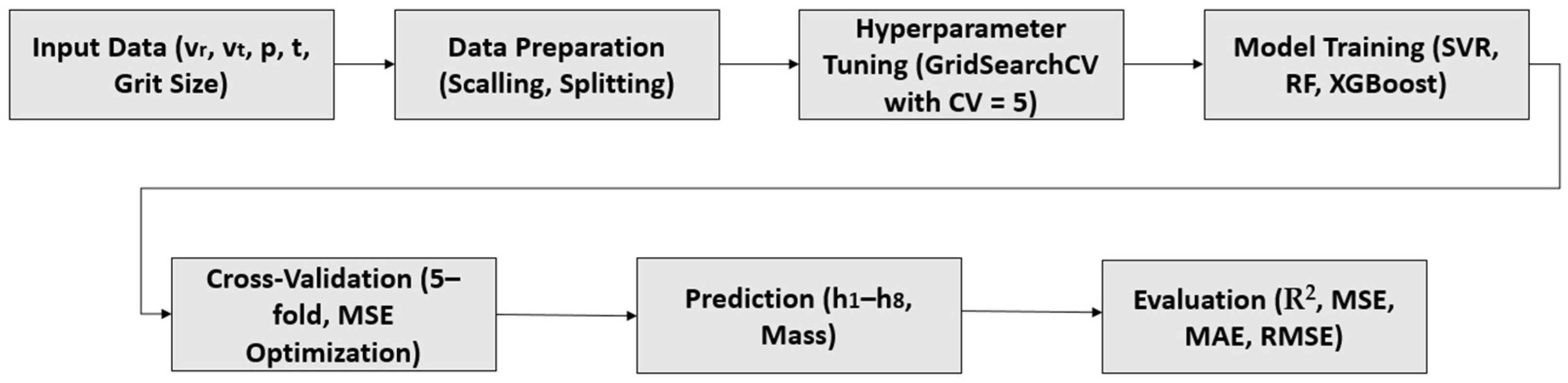 - Lee, S.; Chen, Z.; Luo, Y.; Li, X.; Lu, M. Enhanced Prediction Accuracy in High-speed Grinding of Brittle Materials using Advanced Machine Learning Technique. J. Intell. Manuf. 2024, 36, 5415–5439. [Google Scholar] [CrossRef]