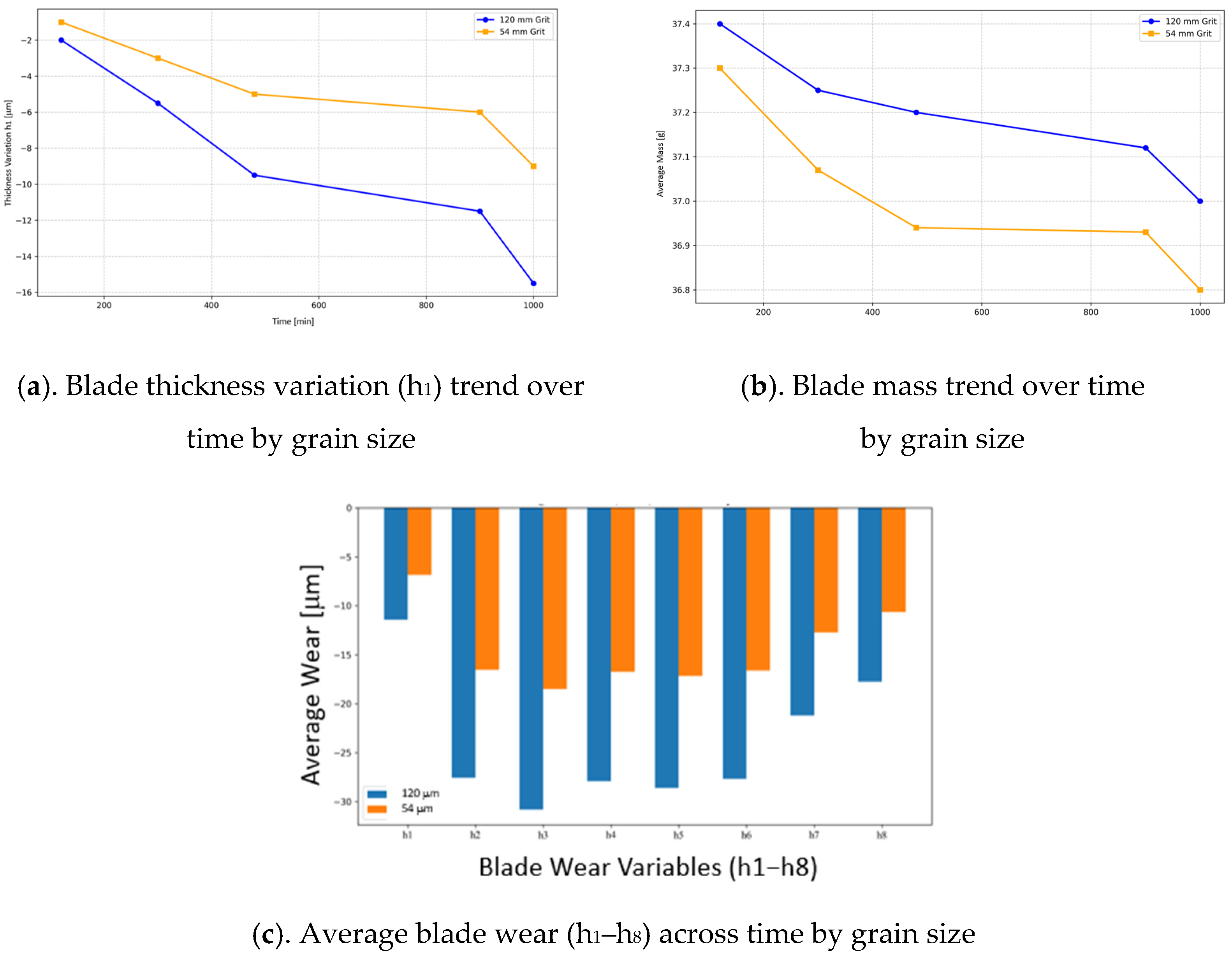 | Blade No. | Time [min] | Thickness Variation of Abrasive Blade | Mass [g] | |||||||