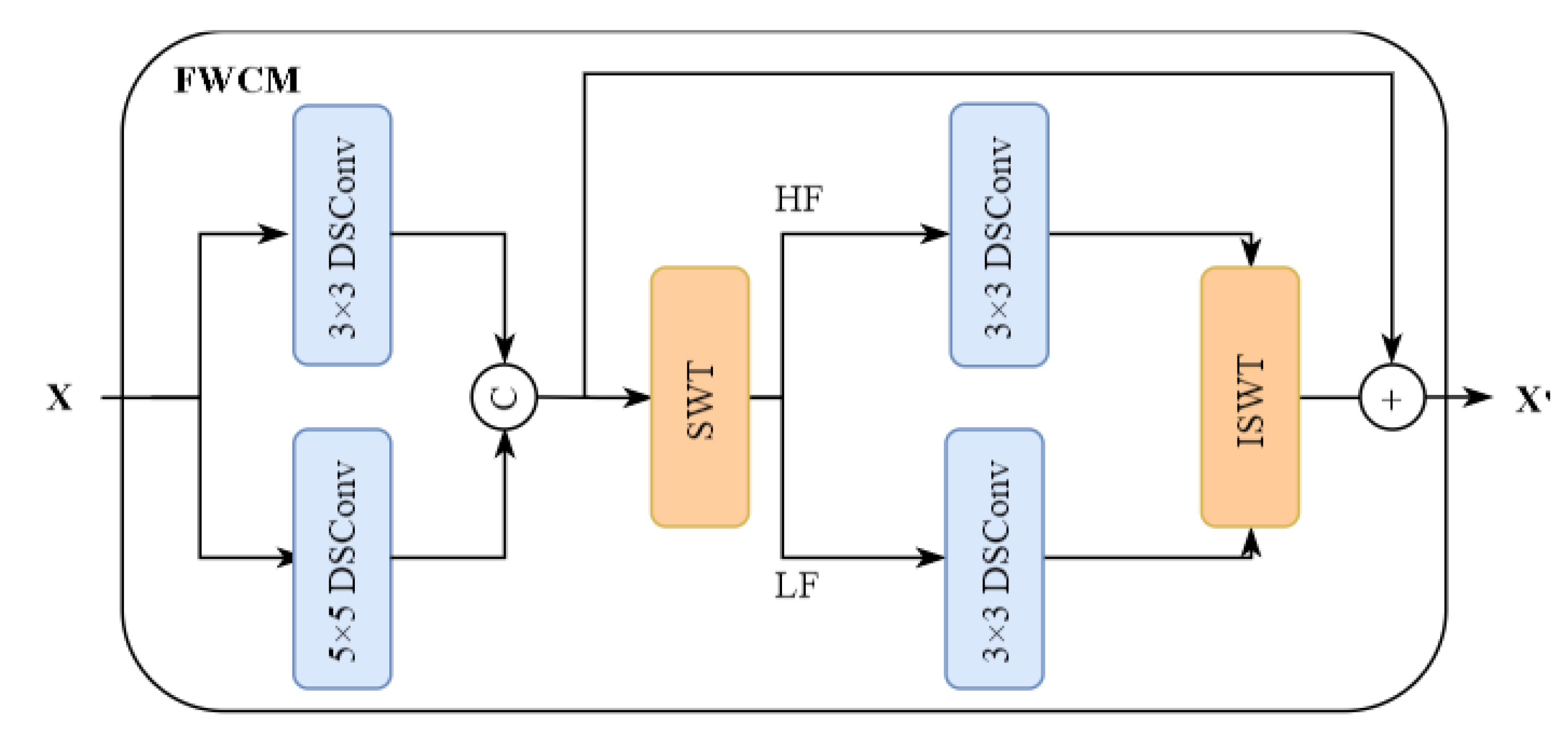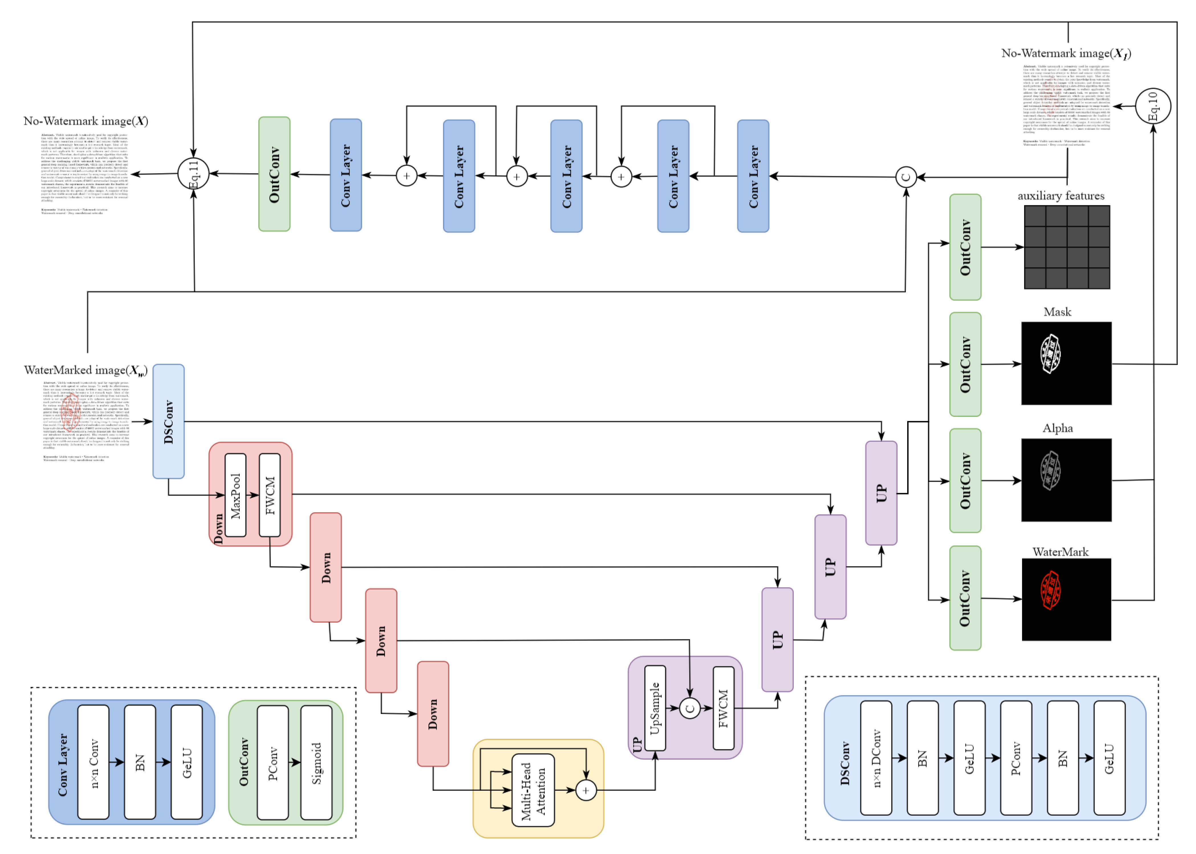- Building on TextLogo, we propose a frequency-enhanced watermark removal network, FE-WRNet. Central to this network is the FWCM submodule, which operates jointly in the spatial domain and the discrete wavelet domain to capture watermark edges and structural information more effectively. Additionally, a hybrid loss based on spatial and wavelet domains is designed to enhance the model’s perception of details and edge information.