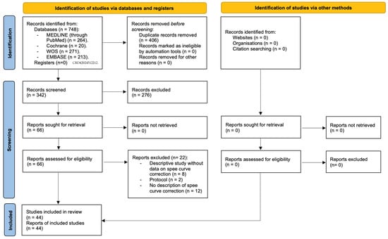 The initial search, carried out in the aforementioned databases, brought together 748 studies. After removing duplicates, 342 studies were selected for reading the title and abstract. Afterwards, all studies that did not fulfil the previously defined eligibility criteria were excluded, resulting in 66 studies for full reading. As 22 articles did not fulfil the inclusion criteria (Table A2), 44 were included in the qualitative analysis. The identification, screening and eligibility process are described in the PRISMA diagram (Figure 1).