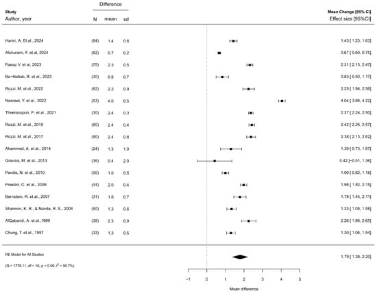 The quantitative analysis of the data of clinical studies was carried out through meta-analysis using a random-effects model (DerSimonian–Laird method) in the Metafor software in R v4.1.2 [23]. The depth of the Curve of Spee was measured as the perpendicular distance from a reference plane—connecting the incisal edges of the central incisors and the distal cusp tips of the most posterior teeth—to the deepest cusp tip, averaged between the right and left sides. Differences in measurement protocols between studies were minimized by analyzing the within-study change from pre-to post-treatment.