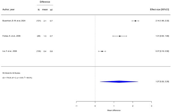 Regarding studies comparing conventional appliances in conjunction with dental extractions (Figure 3), the effect size is 1.27 with a 95% confidence interval ranging from 0.26 to 2.29, which suggests a significant positive difference in the overall effect. It should be noted that the lower confidence interval is close to zero, which indicates a lower certainty in the combined estimate. Heterogeneity was also high (τ2 = 0.784 [0.204–30.953]; I2 = 98.3% [93.9–99.9]).
