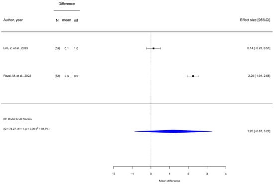 Regarding invisible aligners (Figure 4), the graph shows high variability among the included studies, and although there is a trend towards a positive difference, the overall results are not conclusive due to the wide confidence interval. Heterogeneity was substantial (τ2 = 2.199 [0.414–100.0]; I2 = 98.7% [93.2–99.9]).