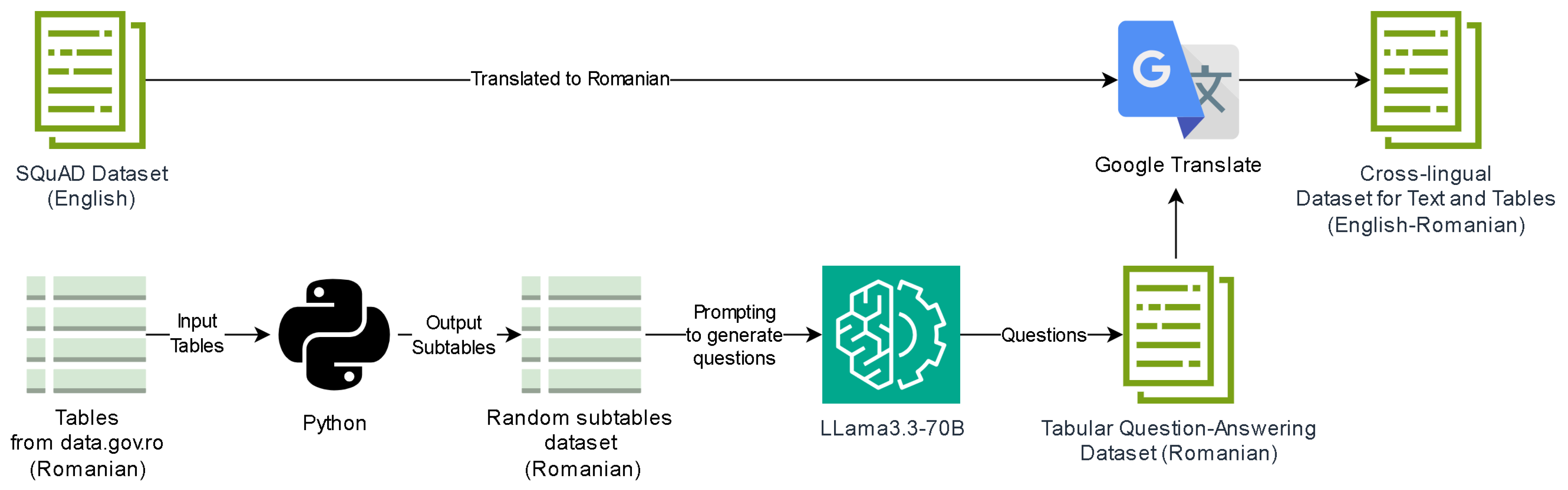 Figure 1 represents the flowchart of the first stage of the proposed pipeline, illustrating the process of dataset construction. In this phase, the Romanian–English bilingual dataset was created by combining unstructured textual data from SQuAD with structured tabular data from the Romanian open data portal. Synthetic questions were generated using Llama 3.3-70B, and all components were automatically translated with Google Translate to form a cross-lingual dataset for both text and tables.