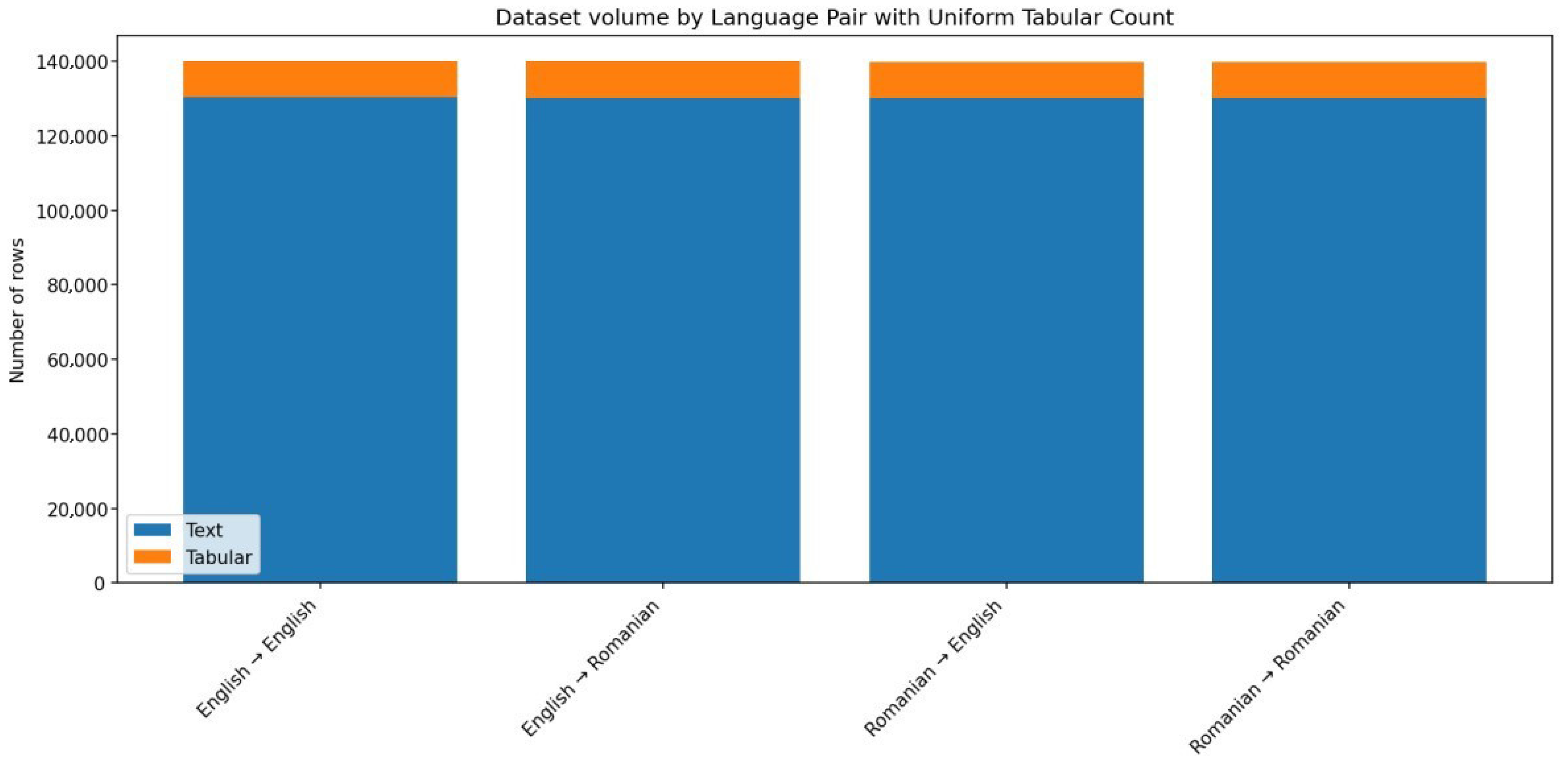 Figure 2, which shows the relative contribution of text and tabular components across the four language pairs (Eng-Eng, EngRo, Ro-Eng, and Ro-Ro). As can be seen, the unstructured textual data represents the majority of the corpus, with nearly 130,000 entries per language pair. The structured tabular component contributes an additional 9750 rows per language pair. Consequently, the dataset provides a balanced evaluation framework for models that must handle both free-text and structured inputs, while also testing their robustness across monolingual and cross-lingual scenarios.