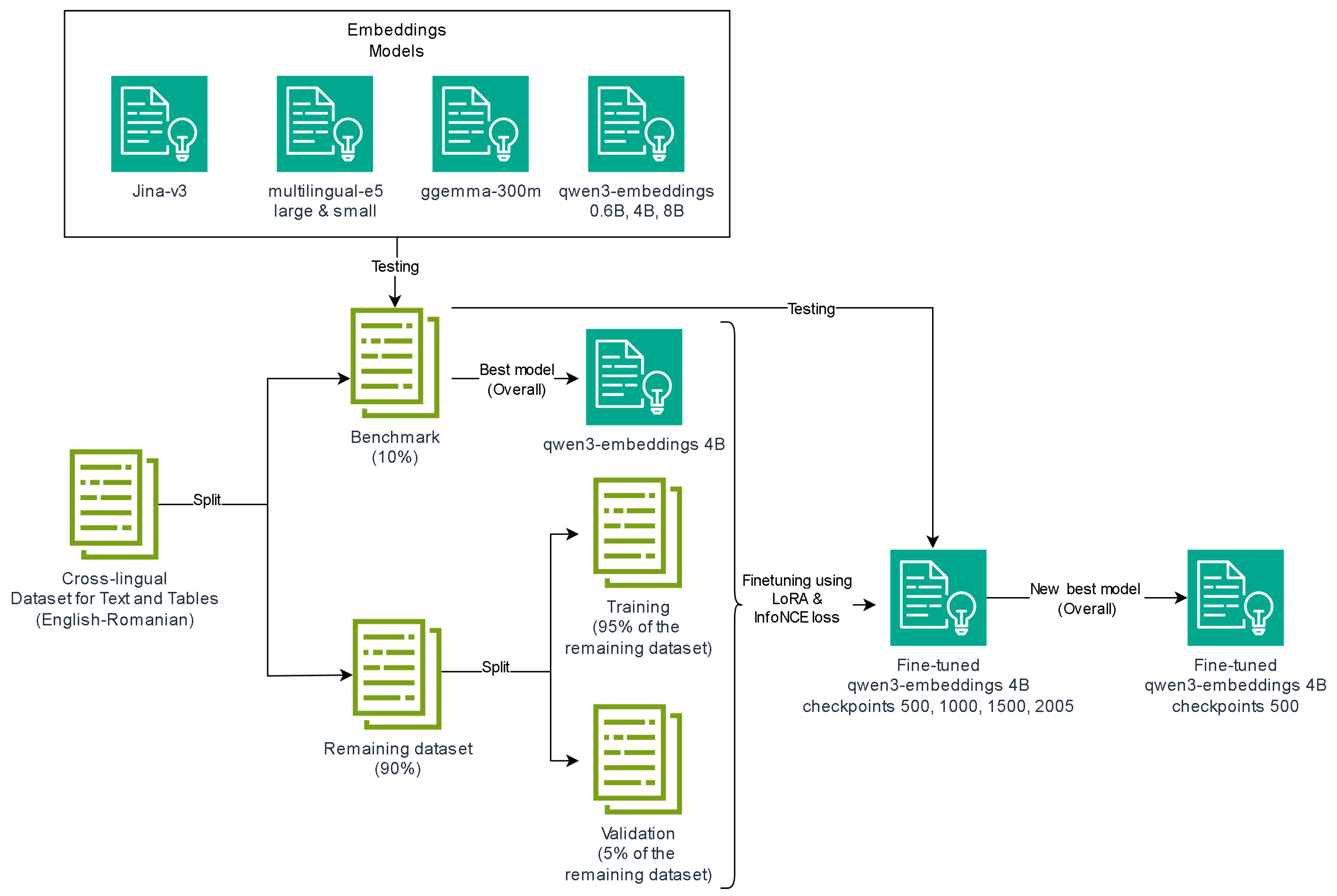 Figure 3 represents the flowchart of the second stage of the proposed pipeline, illustrating the model evaluation and fine-tuning process. In this phase, several embedding models were benchmarked on the bilingual dataset, followed by the selection and fine-tuning of the best-performing model (qwen3-embeddings-4B) using LoRA and the InfoNCE loss. All steps shown in this figure are described in detail in the following paragraphs.