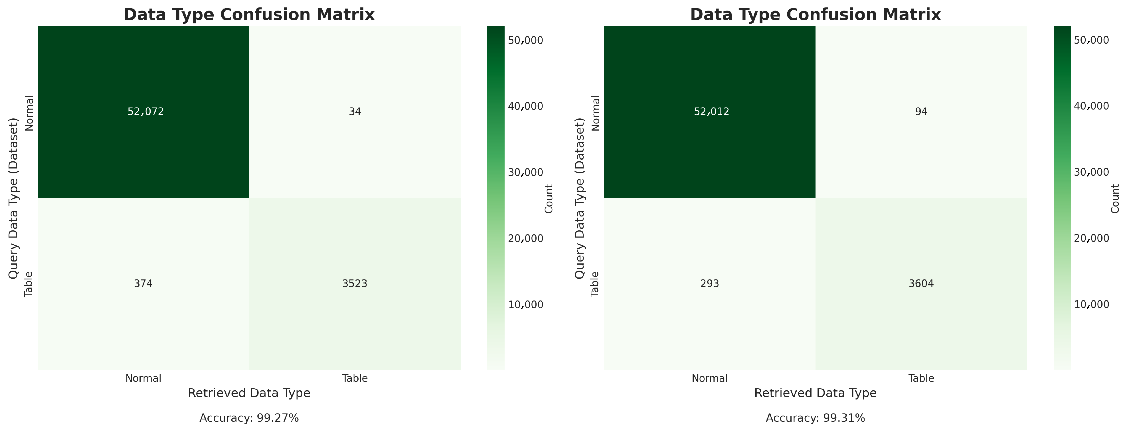 Beyond language alignment, a complementary analysis was conducted to evaluate the models’ ability to distinguish between different data modalities, unstructured text (“Normal”) and structured tables (“Table”). This evaluation does not assess semantic correctness but focuses exclusively on whether the model retrieves the correct type of data corresponding to the query. Such an analysis helps verify that fine-tuning improves cross-lingual behavior without compromising modality awareness, which is crucial for maintaining retrieval consistency in mixed-type datasets.