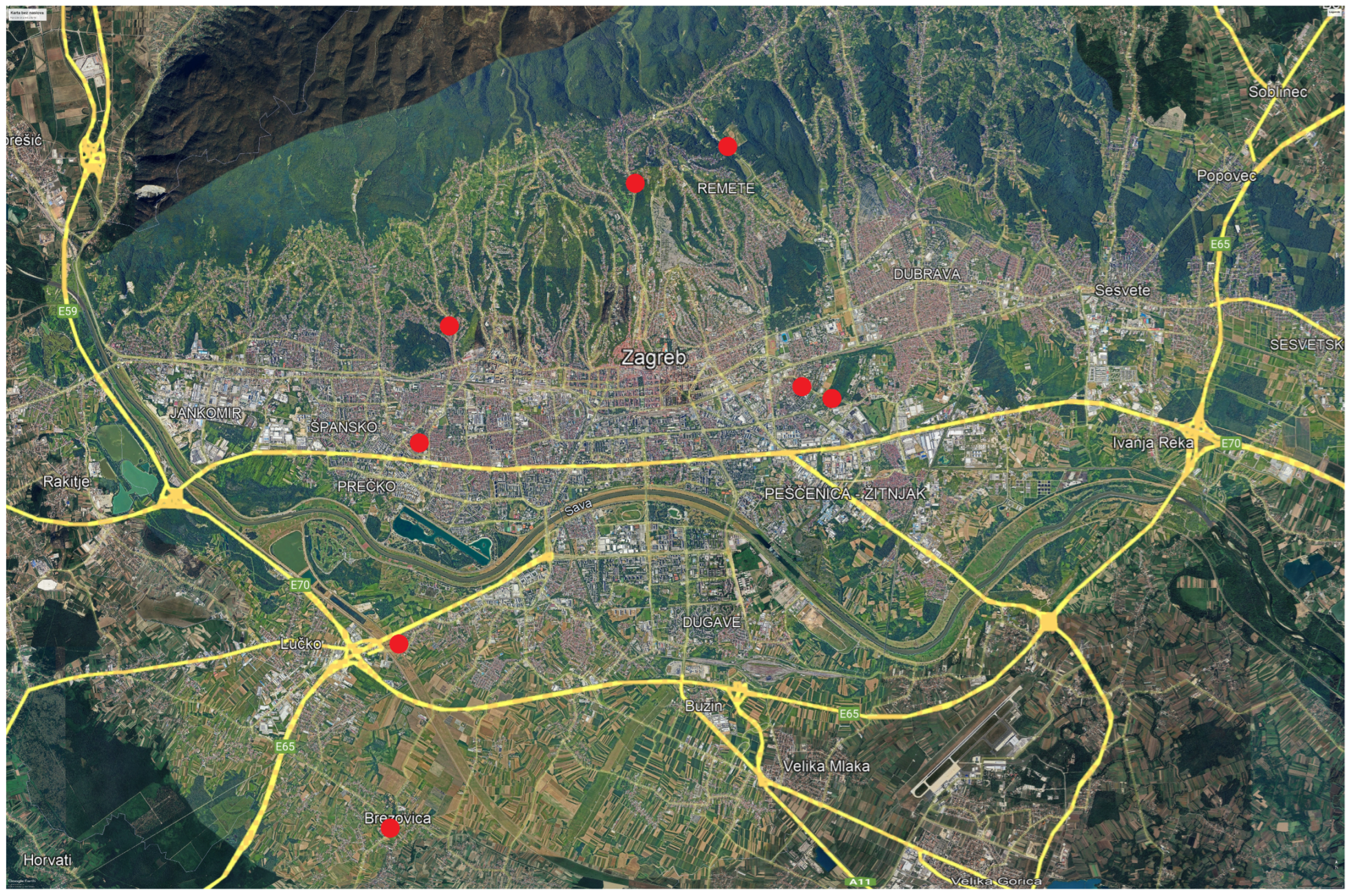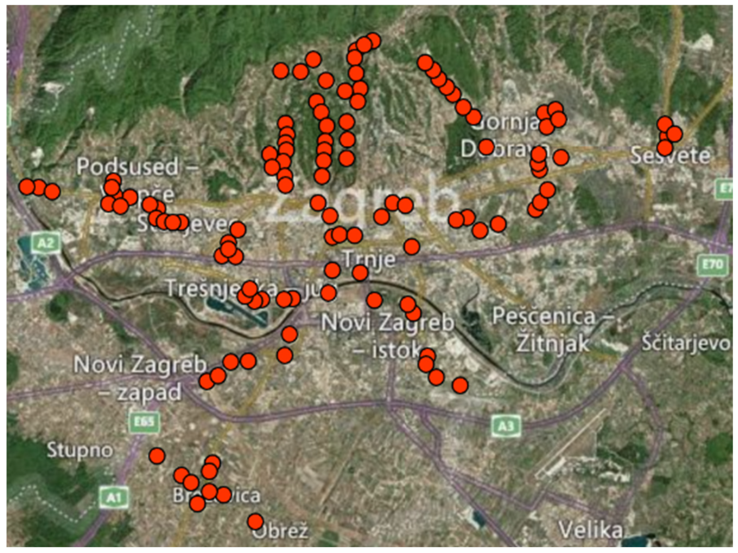 Figure 5 shows the spatial distribution of the eight speed bump sites in Zagreb, where UAV-based traffic counting and vehicle speed measurements were performed. Red markers indicate the locations of analyzed speed bumps.