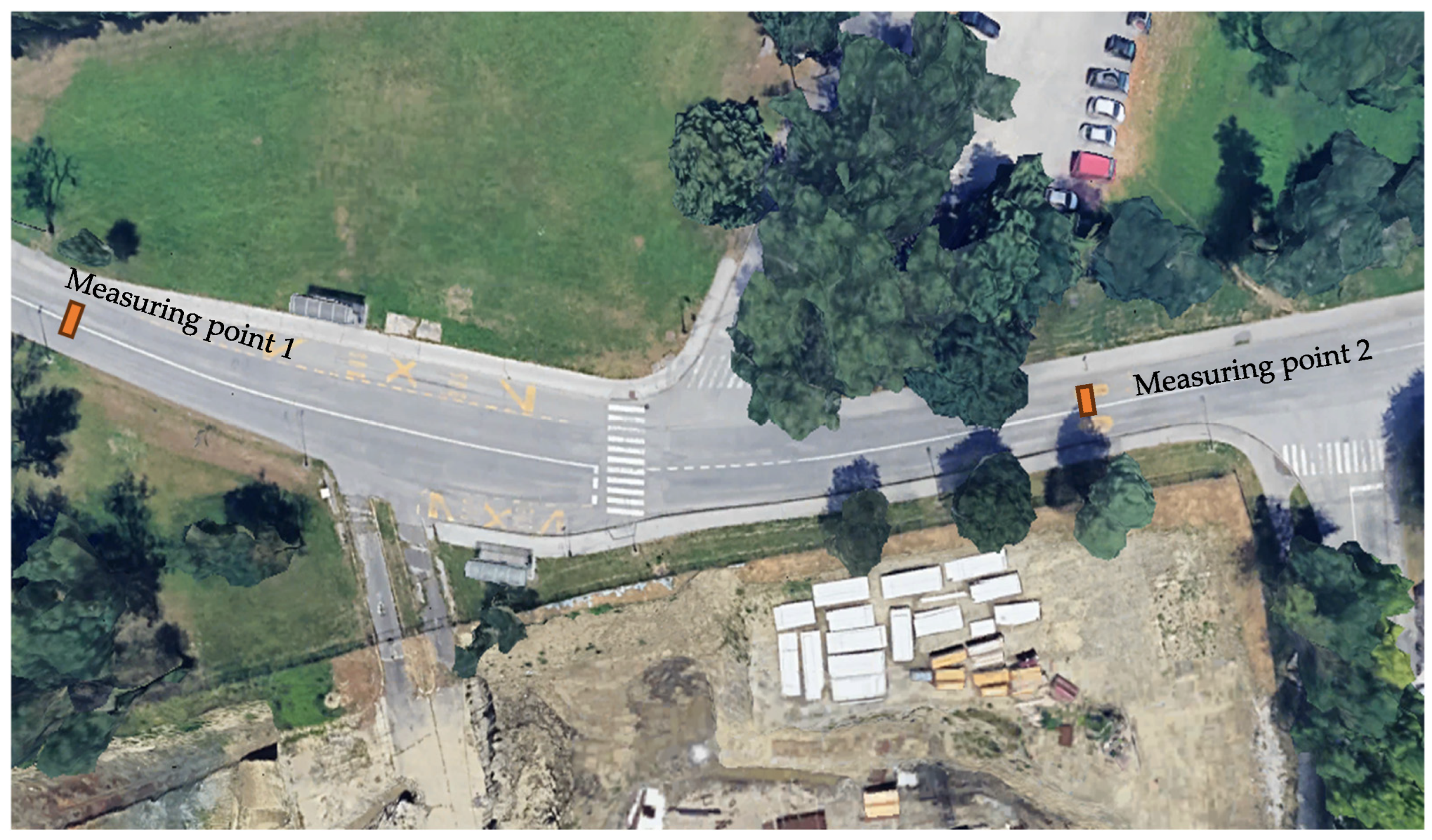 Figure 2 illustrates the placement of measurement points at one of the analyzed locations. In this example, vehicle speeds were recorded in the west–east direction. Vehicles detected at the first measurement point were tracked until they exited the zone at the second point, enabling a detailed analysis of their speed profiles.