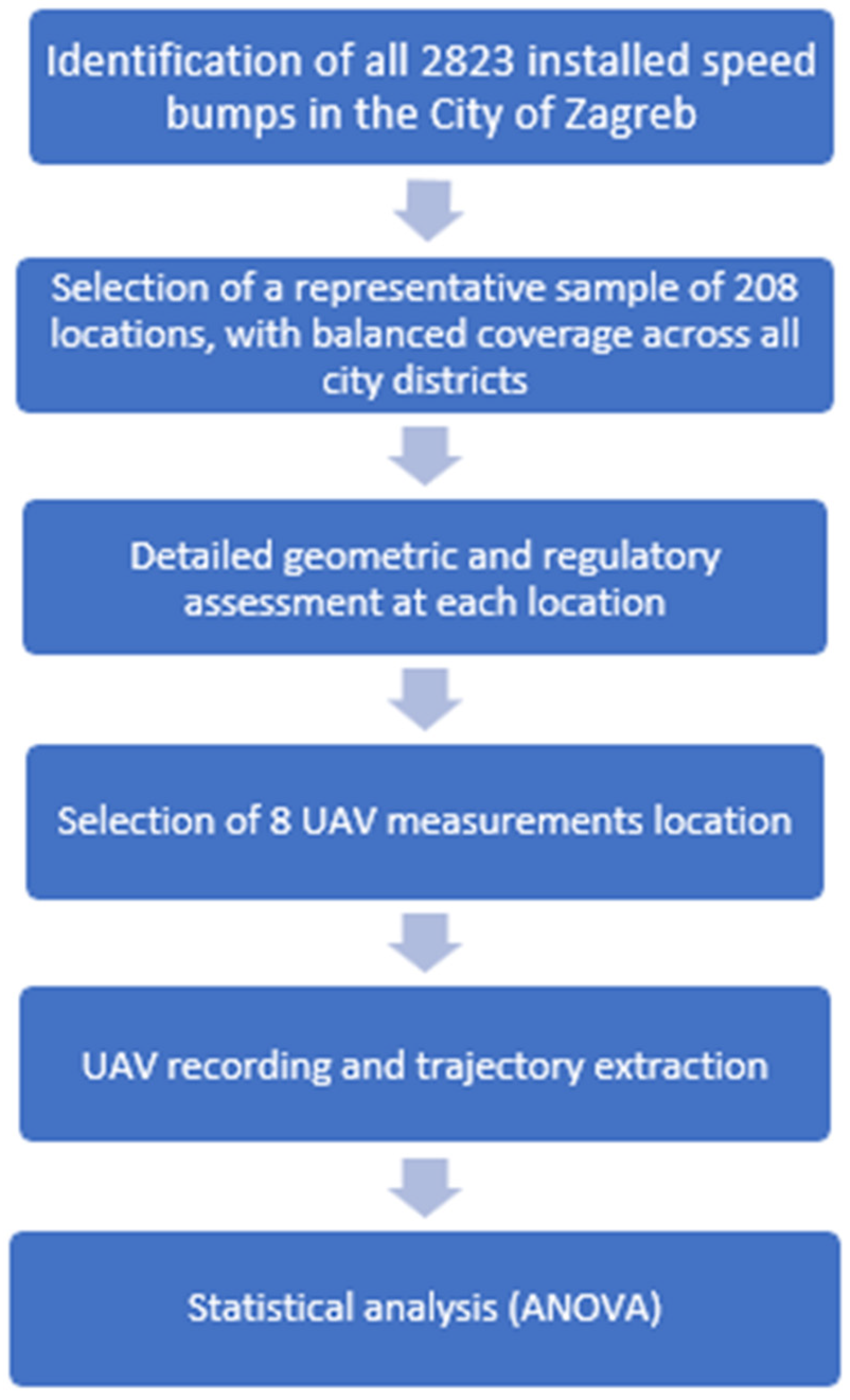 This study addresses these gaps by combining a comprehensive inventory of all 2823 speed bumps in Zagreb, detailed geometric inspection at 208 locations, and UAV-based trajectory extraction at eight representative sites. This multi-layered methodology provides a more robust basis for evaluating speed-management performance and yields empirical insights relevant for urban traffic-safety planning and the standardization of vertical traffic-calming devices.