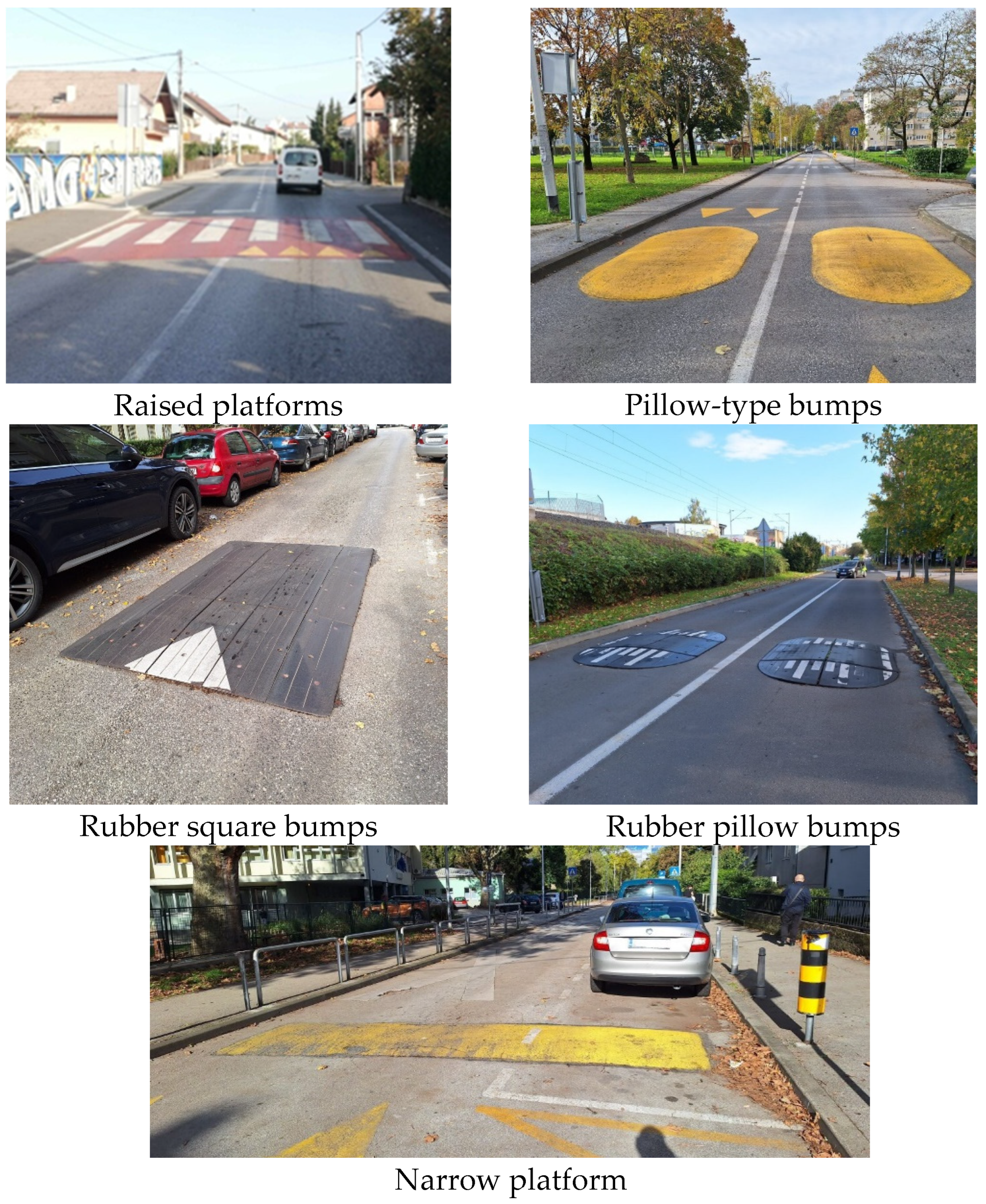 The compliance of each speed bump type with national regulations was assessed based on height, length, surface material, and proper signage. Field inspections in Zagreb identified five distinct types of speed bumps (