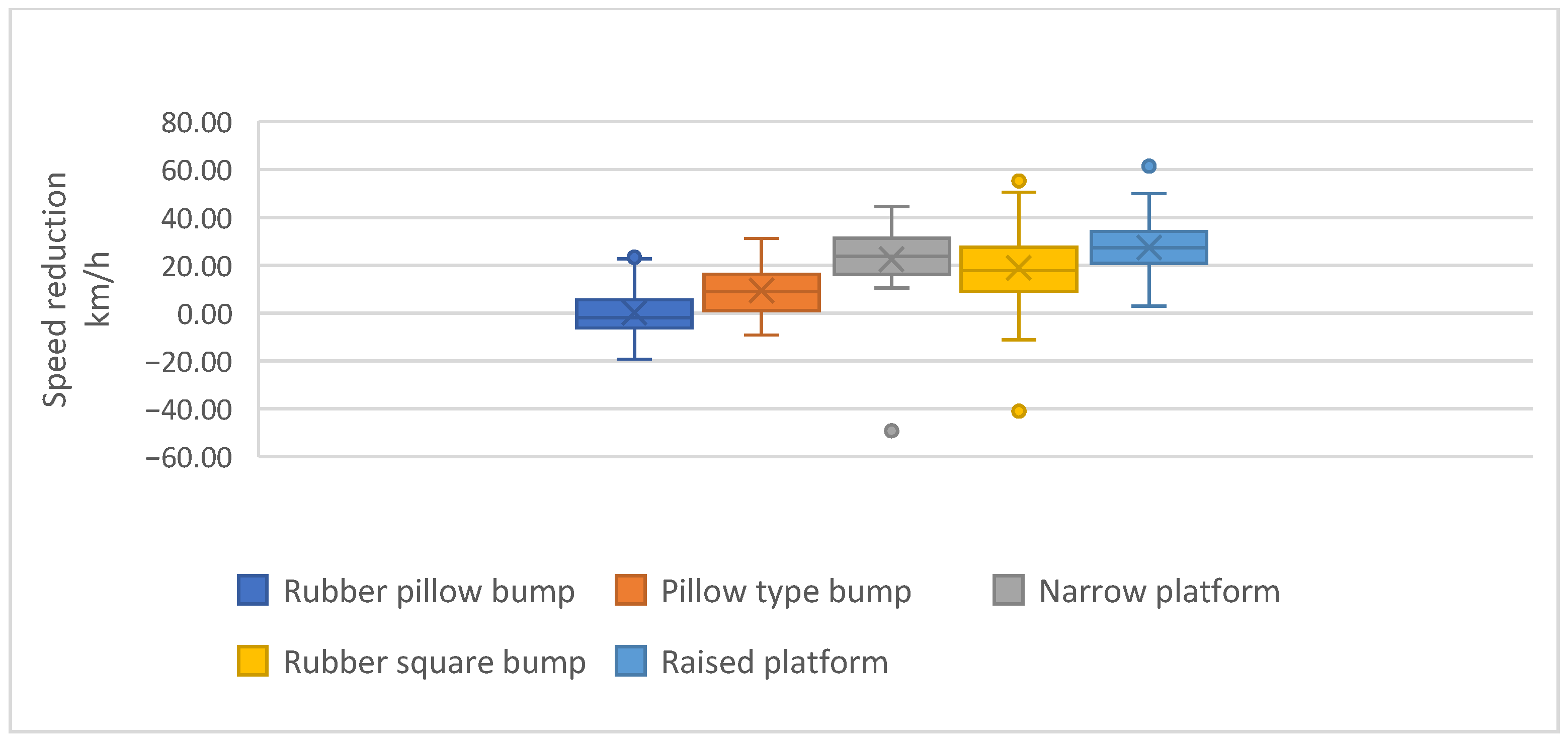 Figure 6) illustrates the distribution of speed reduction by bump type, showing the median, interquartile range (IQR), minimum and maximum values (within 1.5 × IQR), and potential outliers. Rubber pillow bumps exhibited the least reduction, while raised platforms produced the largest effect with the greatest variability. These findings reinforce the ANOVA results, confirming statistically significant differences among bump types (F = 66.93,