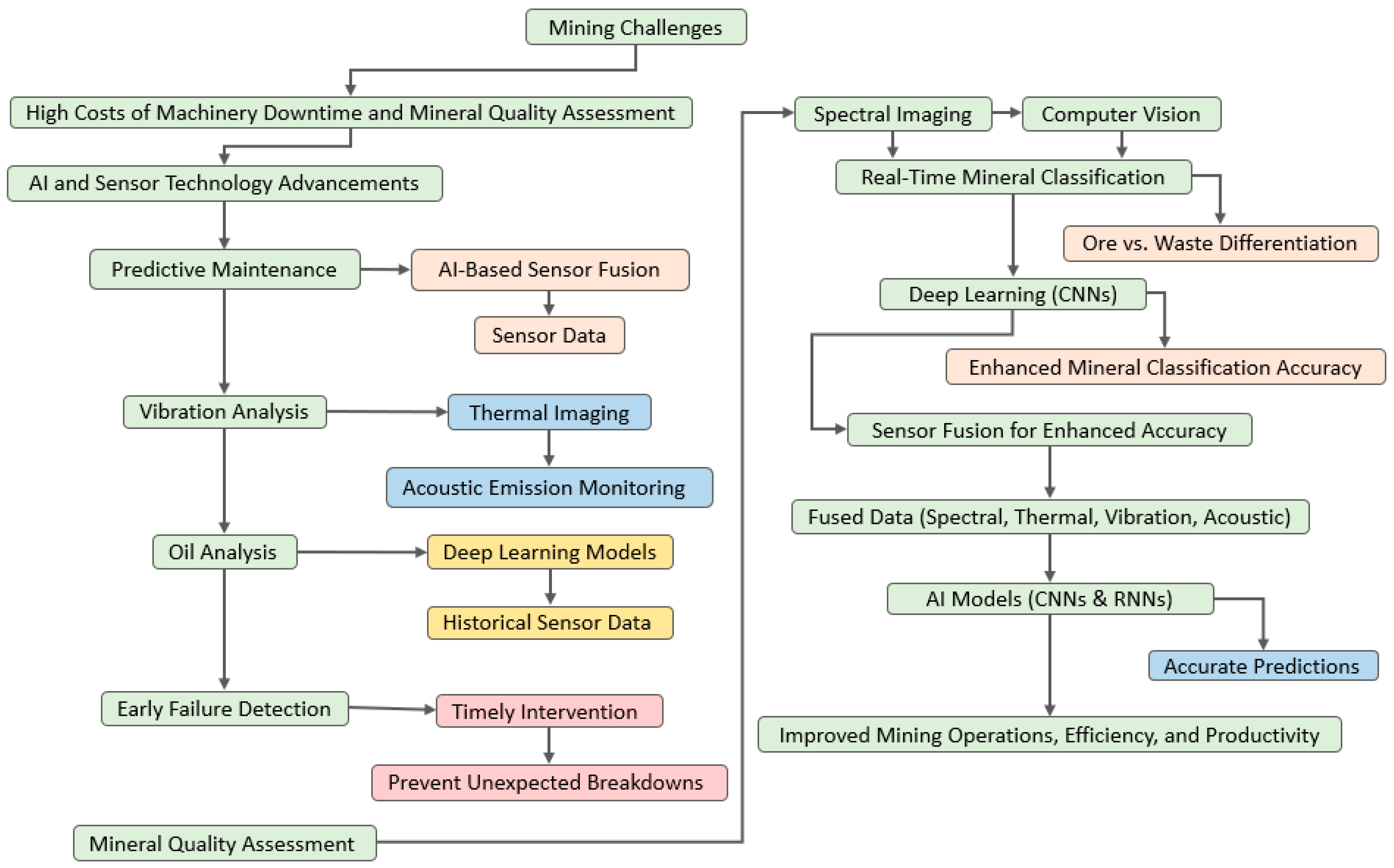 Figure 1 outlines how AI and sensor technologies improve predictive maintenance and mineral quality assessment, integrating multiple sensor inputs through sensor fusion for enhanced accuracy.