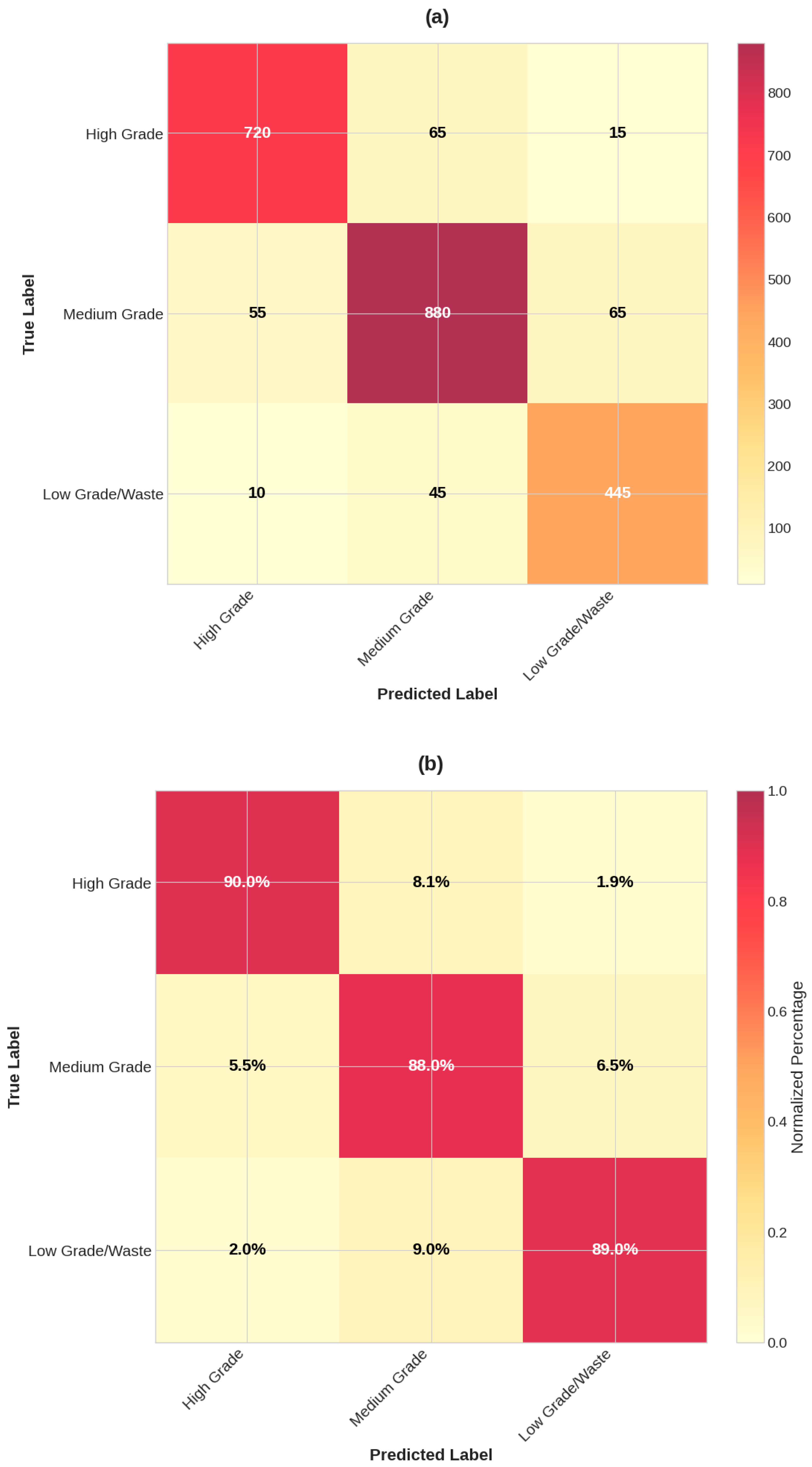 Table 4. This three-class scheme was selected because it aligns with standard industrial practice in iron-ore processing, where materials are operationally categorized into high-yield, mid-grade, and waste streams. It provides a clear balance between classification granularity and dataset representativeness while ensuring that each class contains sufficient examples for robust model training and statistically stable evaluation. Using three categories also facilitates interpretability for mining engineers and aligns the AI system’s outputs with on-site decision-making processes. The consistent adoption of this three-class framework throughout the architecture (