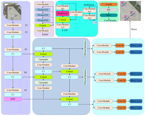 The modular details of the architecture are summarized in Table 1, which presents the output scale, channel dimensions, and modules used at each stage. The backbone is structured across three resolution levels, generating multi-scale features from the P3, P4, and P5 layers. At the P5 stage, the Spatial Pyramid Pooling Fast (SPPF) module is employed to aggregate contextual information across multiple scales, resulting in a compact yet informative representation. The derived multi-scale features are then merged and transmitted across different resolutions via a PANet-based neck. It is at this point that the distinct innovation of the proposed model becomes clear: Efficient Attention (EA) modules are selectively positioned only at the P3 and P4 levels. This targeted placement strengthens the separation of small objects from cluttered backgrounds by refining high-resolution details and, at the same time, supports more consistent learning of spatial relationships for medium-sized objects. By confining EA to the most impactful layers, the architecture avoids unnecessary parameter growth and computation, thereby sustaining a strong trade-off between accuracy and inference efficiency.