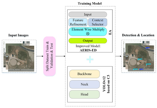 The architectural specifications summarized in Table 1 emphasize the selective attention strategy adopted in AERIS-ED, which is tailored to enhance the detection of small- and medium-sized objects. In terms of model complexity, AERIS-ED contains approximately 14.59 million parameters and 27.9 GFLOPs, demonstrating its lightweight and computationally efficient design compared to conventional YOLO-based detectors. The overall training procedure employed for the model is depicted in Figure 2.