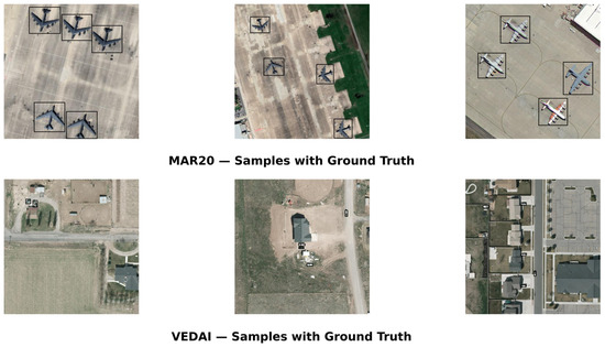 Three selected examples from each dataset are presented in Figure 5. These visuals clearly illustrate the aircraft diversity of MAR20 and the multi-class vehicle compositions of VEDAI across different scene types.