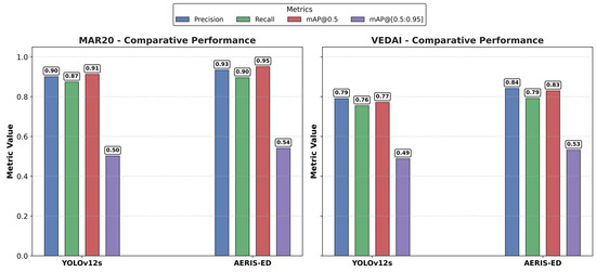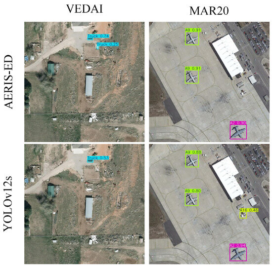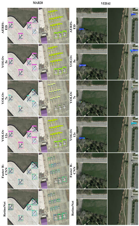 The presented visuals highlight high-resolution aircraft samples from MAR20 alongside the diverse vehicle categories included in VEDAI. Together, these examples illustrate the inherent scale variability and scene complexity of the datasets. As such, they pose a substantial challenge for evaluating whether the AERIS-ED architecture can consistently deliver strong performance, from detecting small-scale targets to handling scenes characterized by dense background clutter.