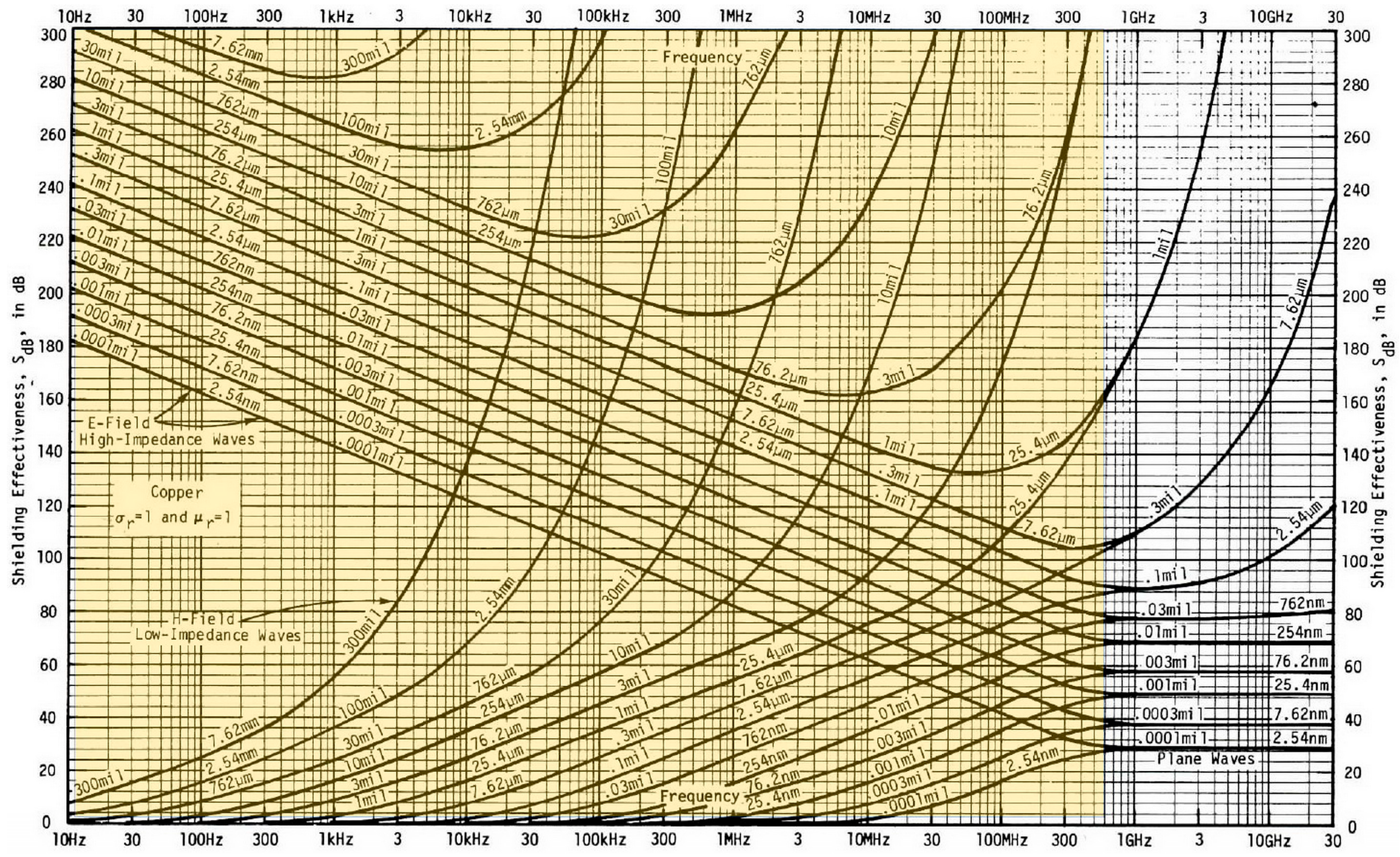 - These materials are of great importance in shielding low-frequency magnetic fields, unlike conductive ones with no magnetic properties, as can be seen in the figure (approx. 20 dB);