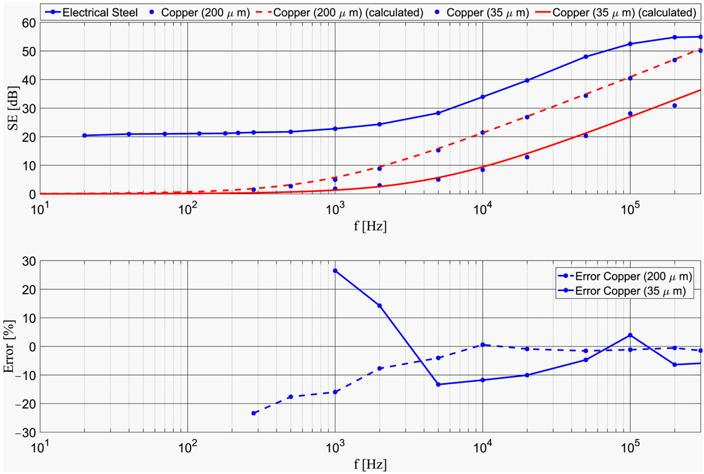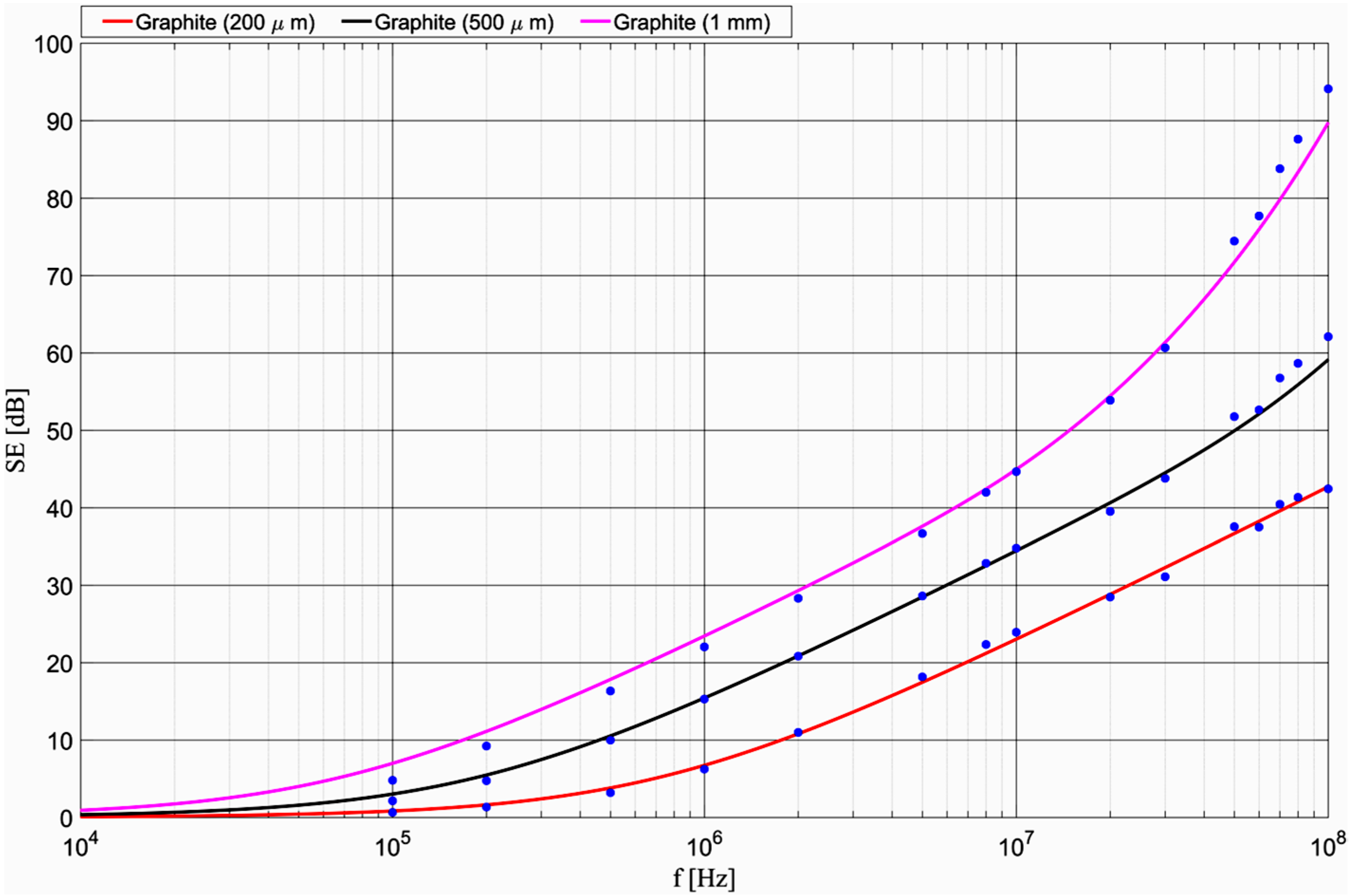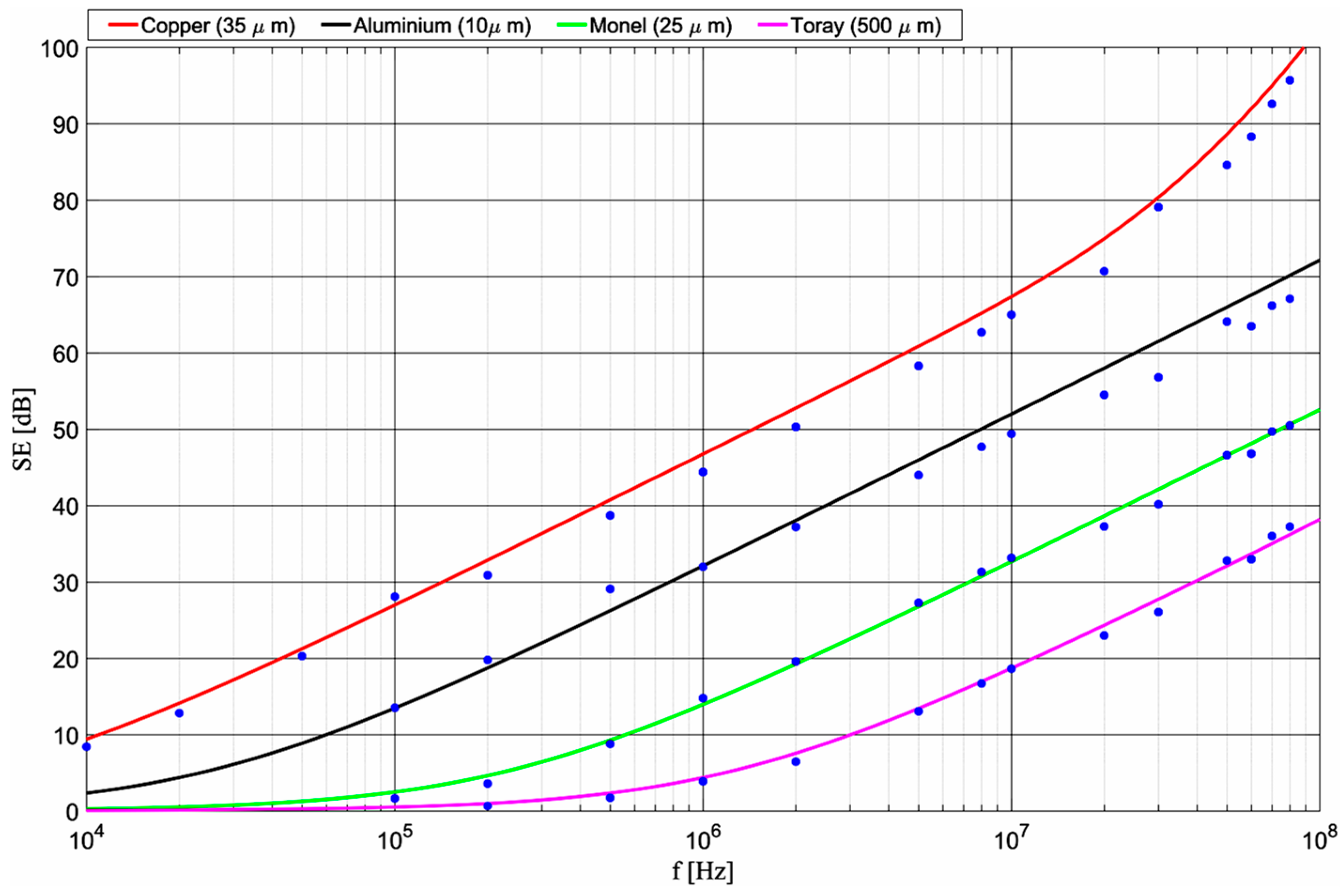 3.2.3. The Dependence of SEdB on the Shield Thickness in the Range 100 kHz–100 MHz