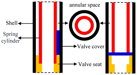 To meet the constraints of the small assembly space for drilling tools, the installation space and motion principle of the pressure controller have been preliminarily determined, as shown in Figure 3. Initially, the valve seat is located at the base of the pressure-preserved component, while the valve cover is vertically installed within the shell-core barrel annulus. After the coring is completed and the controller is triggered, the valve cover flips within the annular space inside the drilling tool. Upon flipping to a horizontal state, the valve cover contacts the lower seat to form the controller’s initial seal, resulting in a self-energizing interface via the tapered sealing principle.