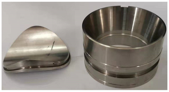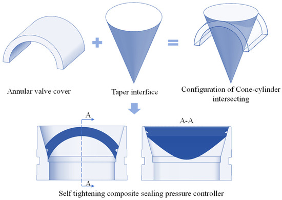 The constrained annular space within the coring tool dictates a departure from the conventional flat-tapered sealing geometry for the valve cover. Furthermore, the design must adopt annular dimensions that conform to the structural parameters of the tool’s lower assembly. The innovative annular valve cover adapts to the assembly space while meeting the boundary conditions of the conical self-tightening seal, resulting in an inverted design perpendicular to the valve seat’s central axis. Combining the spatial geometric characteristics of the intersection line, the configuration design of the pressure controller shown in Figure 4 is completed.