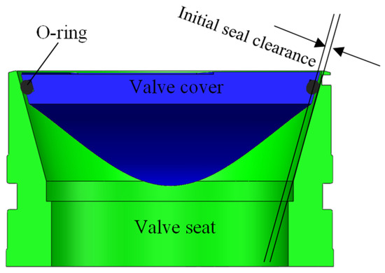 Leveraging the conical self-tightening seal principle and the spatial features of intersection lines, we designed an innovative self-energizing pressure controller, with its sealing mechanism shown in Figure 5. The non-standard sealing interface of the valve cover is processed with a sealing groove to install a rubber O-ring, which can achieve initial sealing under a small spring preload. As pressure on the valve cover rises, the sealing ring is first compressed. The metal sealing interfaces then fully conform, eliminating the sealing gap. This enables the assembly to withstand higher pressure loads while enhancing sealing performance.
