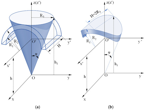 Geometric configuration diagram of cone and column intersection: (a) Conic and torus surface parameters; (b) Intersecting surface parameters.