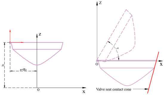 By defining h2 = e + R3, substituting x, y and z from Formula (9) into Equation (12), and combining them with the translated conical contact surface equation of the valve seat, we obtain the equation of the interference region: