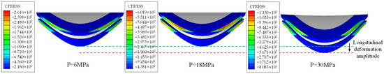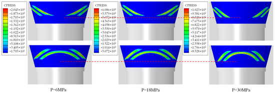Figure 12 presents the contact pressure contour plots on the valve seat sealing surface under different pressure conditions, through which the variation patterns of contact zones can be systematically analyzed.