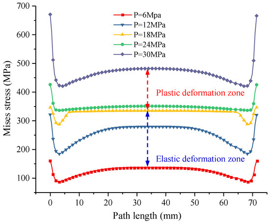 Figure 15 presents the stress variation curves along the central axis path on the lower surface of the valve cover under different operating conditions. The stress peaks at both ends of the curves represent the direct contact regions between the valve cover and valve seat. These regions act as the primary load-bearing zones. The stress peaks at both curve ends correspond to direct contact regions between the valve cover and seat, functioning as primary load-bearing zones. In the central portion, stress follows a characteristic middle-high, edge-low distribution. All stress magnitudes grow progressively with hydraulic load. At 18 MPa, the central stress profile forms a plateau approaching the material’s yield strength. When pressure reaches 24 MPa, central axis stresses show minimal increase, stabilizing near the yield threshold. However, beyond a loading of 24 MPa, a significant escalation in von Mises stress occurs, indicating the initiation of plastic deformation in the central axis vicinity. Thus, 24 MPa hydraulic pressure can be identified as the critical threshold for the onset of plastic deformation in the central axis region of the valve cover lower surface.