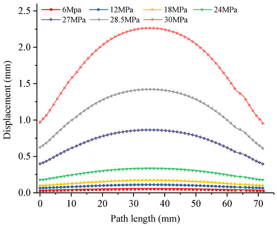 Figure 16 illustrates the displacement variation curves along the central axis points on the lower surface of the valve cover under different operating conditions. As previously analyzed, the region near the central axis enters the plastic deformation zone when the load exceeds 24 MPa. Therefore, displacement variation curves at 27 MPa and 28.5 MPa loads are included for comparative analysis. The maximum displacement along the entire central axis occurs in the middle region, with a significant increase in displacement increment observed when the load surpasses 24 MPa, as shown in Table 2. The valve cover exhibits an overall concave deformation pattern, while the contact regions at both sealing surfaces provide supporting constraints, resulting in relatively smaller displacement variations.